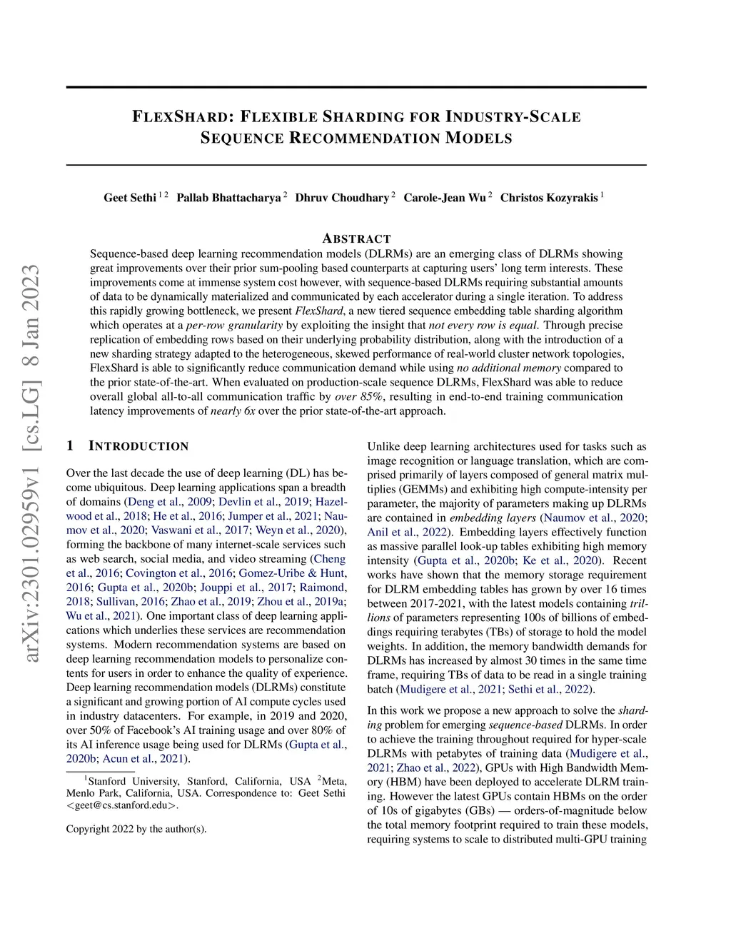 Sequence-based deep learning recommendation models (DLRMs) are an emerging class of DLRMs showing great improvements over their prior sum-pooling based counterparts at capturing users' long term interests. These improvements come at immense system cost however, with sequence-based DLRMs requiring substantial amounts of data to be dynamically materialized and communicated by each accelerator during a single iteration. To address this rapidly growing bottleneck, we present FlexShard, a new tiered sequence embedding table sharding algorithm which operates at a per-row granularity by exploiting the insight that not every row is equal. Through precise replication of embedding rows based on their underlying probability distribution, along with the introduction of a new sharding strategy adapted to the heterogeneous, skewed performance of real-world cluster network topologies, FlexShard is able to significantly reduce communication demand while using no additional memory compared to the prior state-of-the-art. When evaluated on production-scale sequence DLRMs, FlexShard was able to reduce overall global all-to-all communication traffic by over 85%, resulting in end-to-end training communication latency improvements of almost 6x over the prior state-of-the-art approach.
