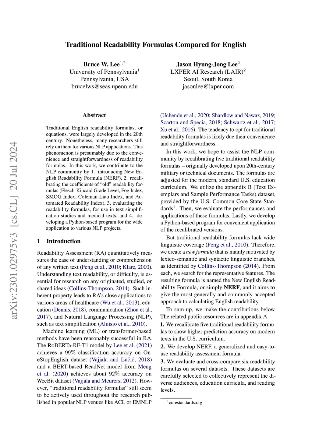 Traditional English readability formulas, or equations, were largely developed in the 20th century. Nonetheless, many researchers still rely on them for various NLP applications. This phenomenon is presumably due to the convenience and straightforwardness of readability formulas. In this work, we contribute to the NLP community by 1. introducing New English Readability Formula (NERF), 2. recalibrating the coefficients of old readability formulas (Flesch-Kincaid Grade Level, Fog Index, SMOG Index, Coleman-Liau Index, and Automated Readability Index), 3. evaluating the readability formulas, for use in text simplification studies and medical texts, and 4. developing a Python-based program for the wide application to various NLP projects.