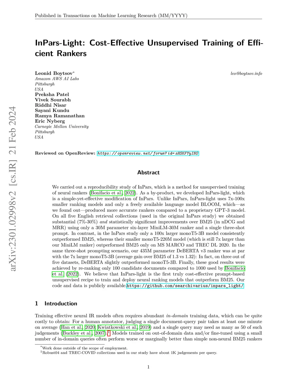 We carried out a reproducibility study of InPars, which is a method for unsupervised training of neural rankers (Bonifacio et al., 2022). As a by-product, we developed InPars-light, which is a simple-yet-effective modification of InPars. Unlike InPars, InPars-light uses 7x-100x smaller ranking models and only a freely available language model BLOOM, which -- as we found out -- produced more accurate rankers compared to a proprietary GPT-3 model. On all five English retrieval collections (used in the original InPars study) we obtained substantial (7%-30%) and statistically significant improvements over BM25 (in nDCG and MRR) using only a 30M parameter six-layer MiniLM-30M ranker and a single three-shot prompt. In contrast, in the InPars study only a 100x larger monoT5-3B model consistently outperformed BM25, whereas their smaller monoT5-220M model (which is still 7x larger than our MiniLM ranker) outperformed BM25 only on MS MARCO and TREC DL 2020. In the same three-shot prompting scenario, our 435M parameter DeBERTA v3 ranker was at par with the 7x larger monoT5-3B (average gain over BM25 of 1.3 vs 1.32): In fact, on three out of five datasets, DeBERTA slightly outperformed monoT5-3B. Finally, these good results were achieved by re-ranking only 100 candidate documents compared to 1000 used by Bonifacio et al. (2022). We believe that InPars-light is the first truly cost-effective prompt-based unsupervised recipe to train and deploy neural ranking models that outperform BM25. Our code and data is publicly available. https://github.com/searchivarius/inpars_light/