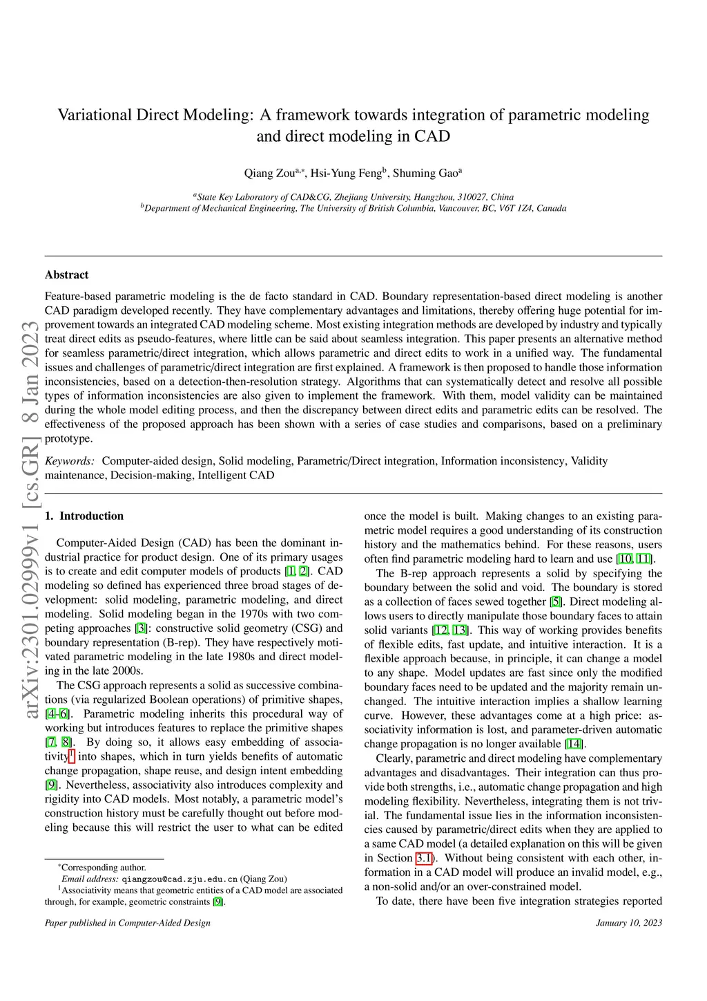 Feature-based parametric modeling is the de facto standard in CAD. Boundary representation-based direct modeling is another CAD paradigm developed recently. They have complementary advantages and limitations, thereby offering huge potential for improvement towards an integrated CAD modeling scheme. Most existing integration methods are developed by industry and typically treat direct edits as pseudo-features, where little can be said about seamless integration. This paper presents an alternative method for seamless parametric/direct integration, which allows parametric and direct edits to work in a unified way. The fundamental issues and challenges of parametric/direct integration are first explained. A framework is then proposed to handle those information inconsistencies, based on a detection-then-resolution strategy. Algorithms that can systematically detect and resolve all possible types of information inconsistencies are also given to implement the framework. With them, model validity can be maintained during the whole model editing process, and then the discrepancy between direct edits and parametric edits can be resolved. The effectiveness of the proposed approach has been shown with a series of case studies and comparisons, based on a preliminary prototype.