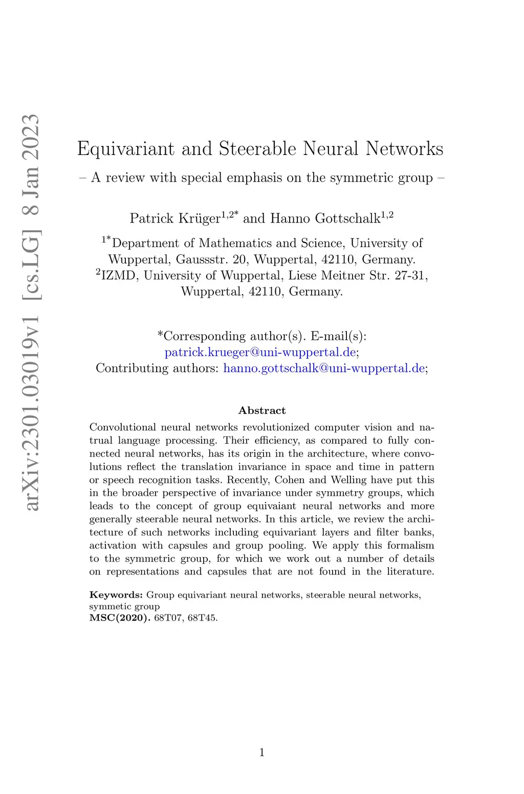 Convolutional neural networks revolutionized computer vision and natrual language processing. Their efficiency, as compared to fully connected neural networks, has its origin in the architecture, where convolutions reflect the translation invariance in space and time in pattern or speech recognition tasks. Recently, Cohen and Welling have put this in the broader perspective of invariance under symmetry groups, which leads to the concept of group equivaiant neural networks and more generally steerable neural networks. In this article, we review the architecture of such networks including equivariant layers and filter banks, activation with capsules and group pooling. We apply this formalism to the symmetric group, for which we work out a number of details on representations and capsules that are not found in the literature.
