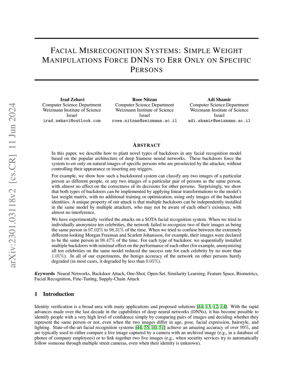 Facial Misrecognition Systems: Simple Weight Manipulations Force DNNs to