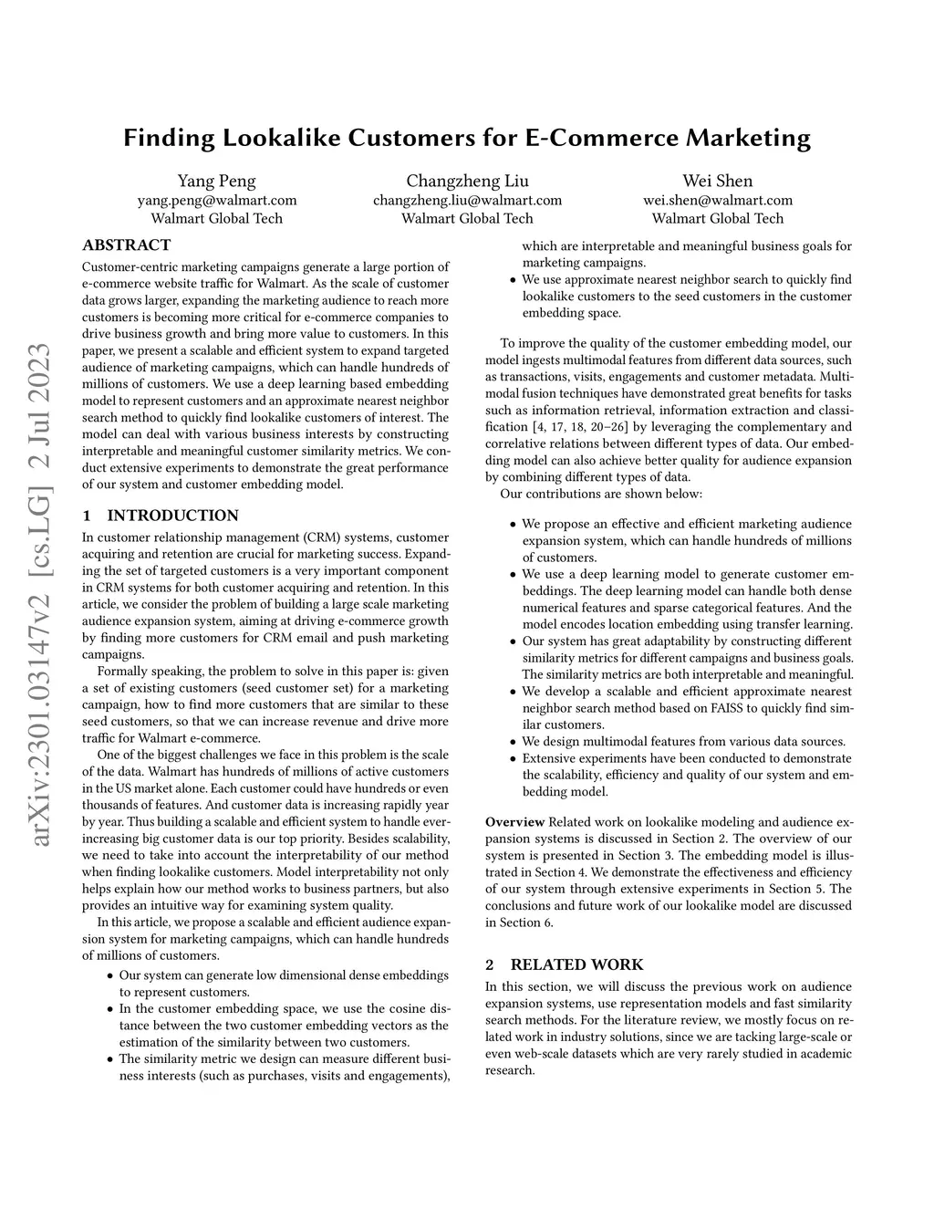 Customer-centric marketing campaigns generate a large portion of e-commerce website traffic for Walmart. As the scale of customer data grows larger, expanding the marketing audience to reach more customers is becoming more critical for e-commerce companies to drive business growth and bring more value to customers. In this paper, we present a scalable and efficient system to expand targeted audience of marketing campaigns, which can handle hundreds of millions of customers. We use a deep learning based embedding model to represent customers and an approximate nearest neighbor search method to quickly find lookalike customers of interest. The model can deal with various business interests by constructing interpretable and meaningful customer similarity metrics. We conduct extensive experiments to demonstrate the great performance of our system and customer embedding model.