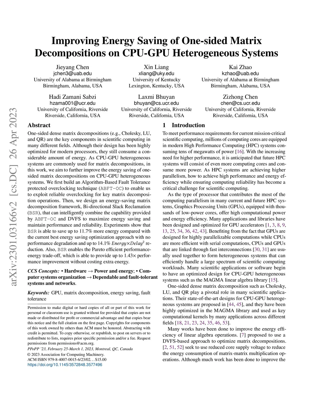 One-sided dense matrix decompositions (e.g., Cholesky, LU, and QR) are the key components in scientific computing in many different fields. Although their design has been highly optimized for modern processors, they still consume a considerable amount of energy. As CPU-GPU heterogeneous systems are commonly used for matrix decompositions, in this work, we aim to further improve the energy saving of one-sided matrix decompositions on CPU-GPU heterogeneous systems. We first build an Algorithm-Based Fault Tolerance protected overclocking technique (ABFT-OC) to enable us to exploit reliable overclocking for key matrix decomposition operations. Then, we design an energy-saving matrix decomposition framework, Bi-directional Slack Reclamation(BSR), that can intelligently combine the capability provided by ABFT-OC and DVFS to maximize energy saving and maintain performance and reliability. Experiments show that BSR is able to save up to 11.7% more energy compared with the current best energy saving optimization approach with no performance degradation and up to 14.1% Energy * Delay^2 reduction. Also, BSR enables the Pareto efficient performance-energy trade-off, which is able to provide up to 1.43x performance improvement without costing extra energy.