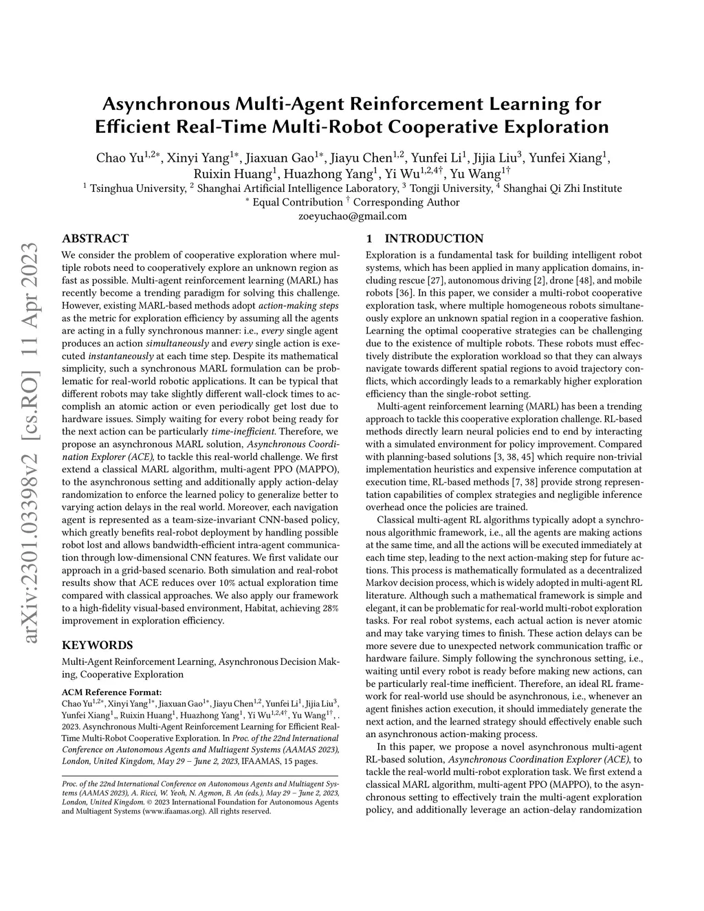 We consider the problem of cooperative exploration where multiple robots need to cooperatively explore an unknown region as fast as possible. Multi-agent reinforcement learning (MARL) has recently become a trending paradigm for solving this challenge. However, existing MARL-based methods adopt action-making steps as the metric for exploration efficiency by assuming all the agents are acting in a fully synchronous manner: i.e., every single agent produces an action simultaneously and every single action is executed instantaneously at each time step. Despite its mathematical simplicity, such a synchronous MARL formulation can be problematic for real-world robotic applications. It can be typical that different robots may take slightly different wall-clock times to accomplish an atomic action or even periodically get lost due to hardware issues. Simply waiting for every robot being ready for the next action can be particularly time-inefficient. Therefore, we propose an asynchronous MARL solution, Asynchronous Coordination Explorer (ACE), to tackle this real-world challenge. We first extend a classical MARL algorithm, multi-agent PPO (MAPPO), to the asynchronous setting and additionally apply action-delay randomization to enforce the learned policy to generalize better to varying action delays in the real world. Moreover, each navigation agent is represented as a team-size-invariant CNN-based policy, which greatly benefits real-robot deployment by handling possible robot lost and allows bandwidth-efficient intra-agent communication through low-dimensional CNN features. We first validate our approach in a grid-based scenario. Both simulation and real-robot results show that ACE reduces over 10% actual exploration time compared with classical approaches. We also apply our framework to a high-fidelity visual-based environment, Habitat, achieving 28% improvement in exploration efficiency.