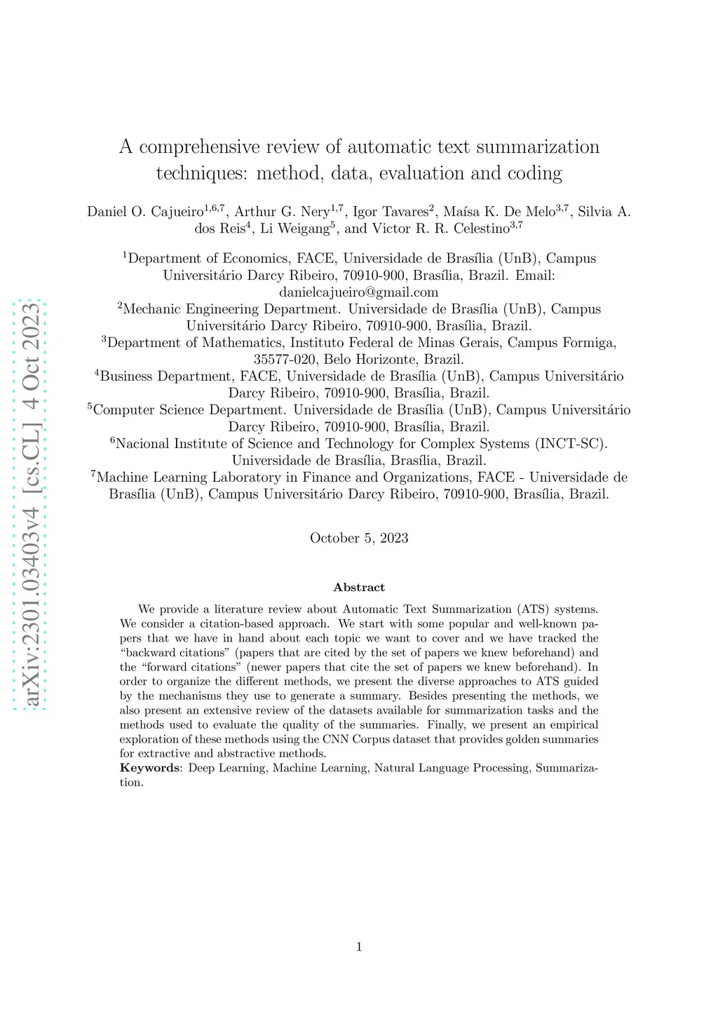We provide a literature review about Automatic Text Summarization (ATS) systems. We consider a citation-based approach. We start with some popular and well-known papers that we have in hand about each topic we want to cover and we have tracked the "backward citations" (papers that are cited by the set of papers we knew beforehand) and the "forward citations" (newer papers that cite the set of papers we knew beforehand). In order to organize the different methods, we present the diverse approaches to ATS guided by the mechanisms they use to generate a summary. Besides presenting the methods, we also present an extensive review of the datasets available for summarization tasks and the methods used to evaluate the quality of the summaries. Finally, we present an empirical exploration of these methods using the CNN Corpus dataset that provides golden summaries for extractive and abstractive methods.