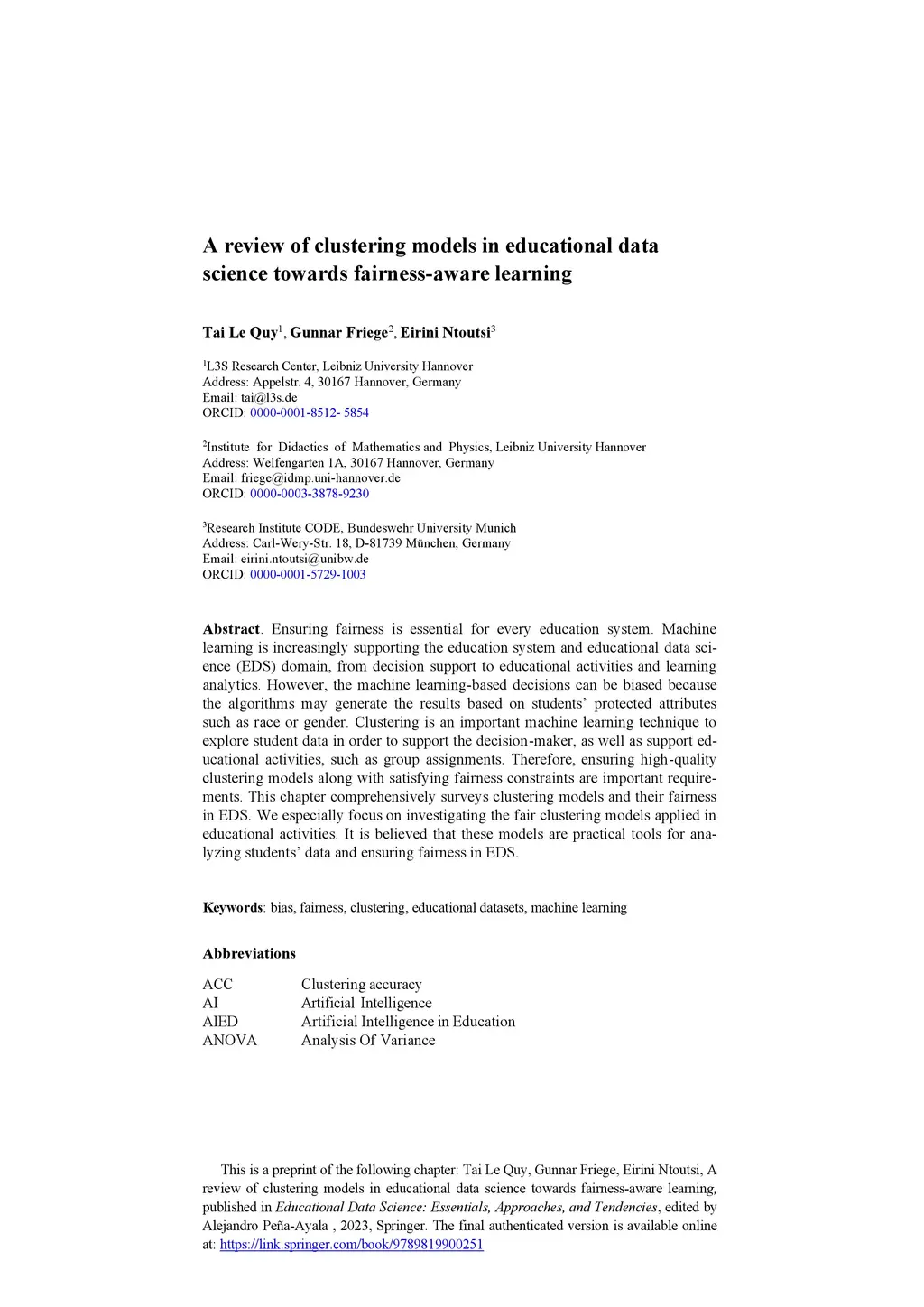 A review of clustering models in educational data science towards