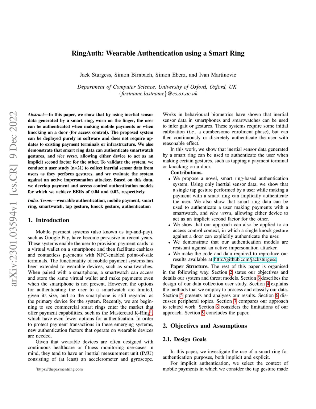 In this paper, we show that by using inertial sensor data generated by a smart ring, worn on the finger, the user can be authenticated when making mobile payments or when knocking on a door (for access control). The proposed system can be deployed purely in software and does not require updates to existing payment terminals or infrastructure. We also demonstrate that smart ring data can authenticate smartwatch gestures, and vice versa, allowing either device to act as an implicit second factor for the other. To validate the system, we conduct a user study (n=21) to collect inertial sensor data from users as they perform gestures, and we evaluate the system against an active impersonation attacker. Based on this data, we develop payment and access control authentication models for which we achieve EERs of 0.04 and 0.02, respectively.
