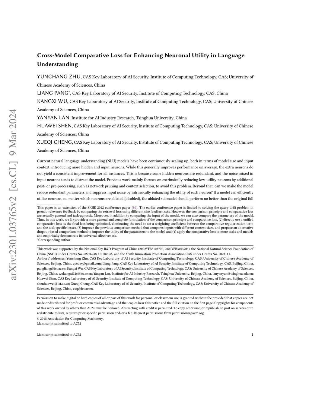 Current natural language understanding (NLU) models have been continuously scaling up, both in terms of model size and input context, introducing more hidden and input neurons. While this generally improves performance on average, the extra neurons do not yield a consistent improvement for all instances. This is because some hidden neurons are redundant, and the noise mixed in input neurons tends to distract the model. Previous work mainly focuses on extrinsically reducing low-utility neurons by additional post- or pre-processing, such as network pruning and context selection, to avoid this problem. Beyond that, can we make the model reduce redundant parameters and suppress input noise by intrinsically enhancing the utility of each neuron? If a model can efficiently utilize neurons, no matter which neurons are ablated (disabled), the ablated submodel should perform no better than the original full model. Based on such a comparison principle between models, we propose a cross-model comparative loss for a broad range of tasks. Comparative loss is essentially a ranking loss on top of the task-specific losses of the full and ablated models, with the expectation that the task-specific loss of the full model is minimal. We demonstrate the universal effectiveness of comparative loss through extensive experiments on 14 datasets from 3 distinct NLU tasks based on 5 widely used pretrained language models and find it particularly superior for models with few parameters or long input.