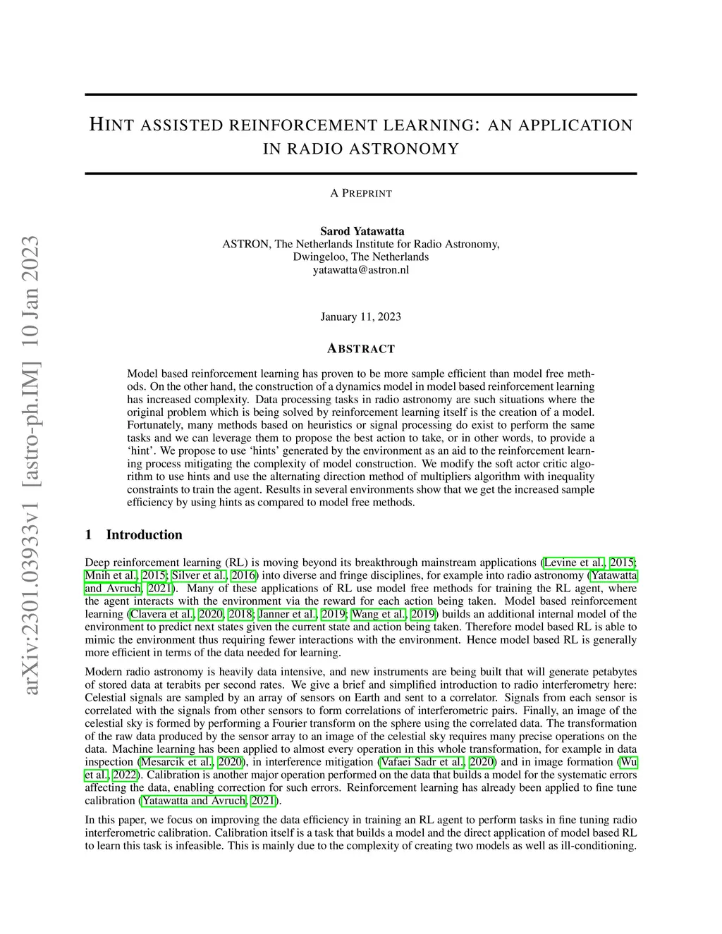 Model based reinforcement learning has proven to be more sample efficient than model free methods. On the other hand, the construction of a dynamics model in model based reinforcement learning has increased complexity. Data processing tasks in radio astronomy are such situations where the original problem which is being solved by reinforcement learning itself is the creation of a model. Fortunately, many methods based on heuristics or signal processing do exist to perform the same tasks and we can leverage them to propose the best action to take, or in other words, to provide a `hint'. We propose to use `hints' generated by the environment as an aid to the reinforcement learning process mitigating the complexity of model construction. We modify the soft actor critic algorithm to use hints and use the alternating direction method of multipliers algorithm with inequality constraints to train the agent. Results in several environments show that we get the increased sample efficiency by using hints as compared to model free methods.