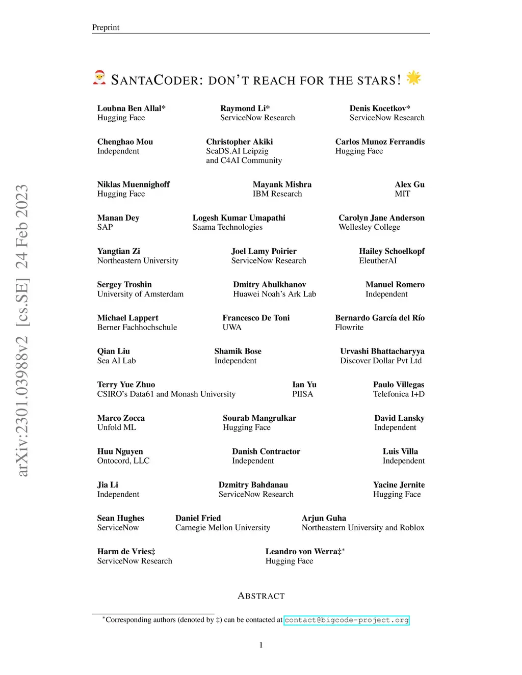 The BigCode project is an open-scientific collaboration working on the responsible development of large language models for code. This tech report describes the progress of the collaboration until December 2022, outlining the current state of the Personally Identifiable Information (PII) redaction pipeline, the experiments conducted to de-risk the model architecture, and the experiments investigating better preprocessing methods for the training data. We train 1.1B parameter models on the Java, JavaScript, and Python subsets of The Stack and evaluate them on the MultiPL-E text-to-code benchmark. We find that more aggressive filtering of near-duplicates can further boost performance and, surprisingly, that selecting files from repositories with 5+ GitHub stars deteriorates performance significantly. Our best model outperforms previous open-source multilingual code generation models (InCoder-6.7B and CodeGen-Multi-2.7B) in both left-to-right generation and infilling on the Java, JavaScript, and Python portions of MultiPL-E, despite being a substantially smaller model. All models are released under an OpenRAIL license at https://hf.co/bigcode.