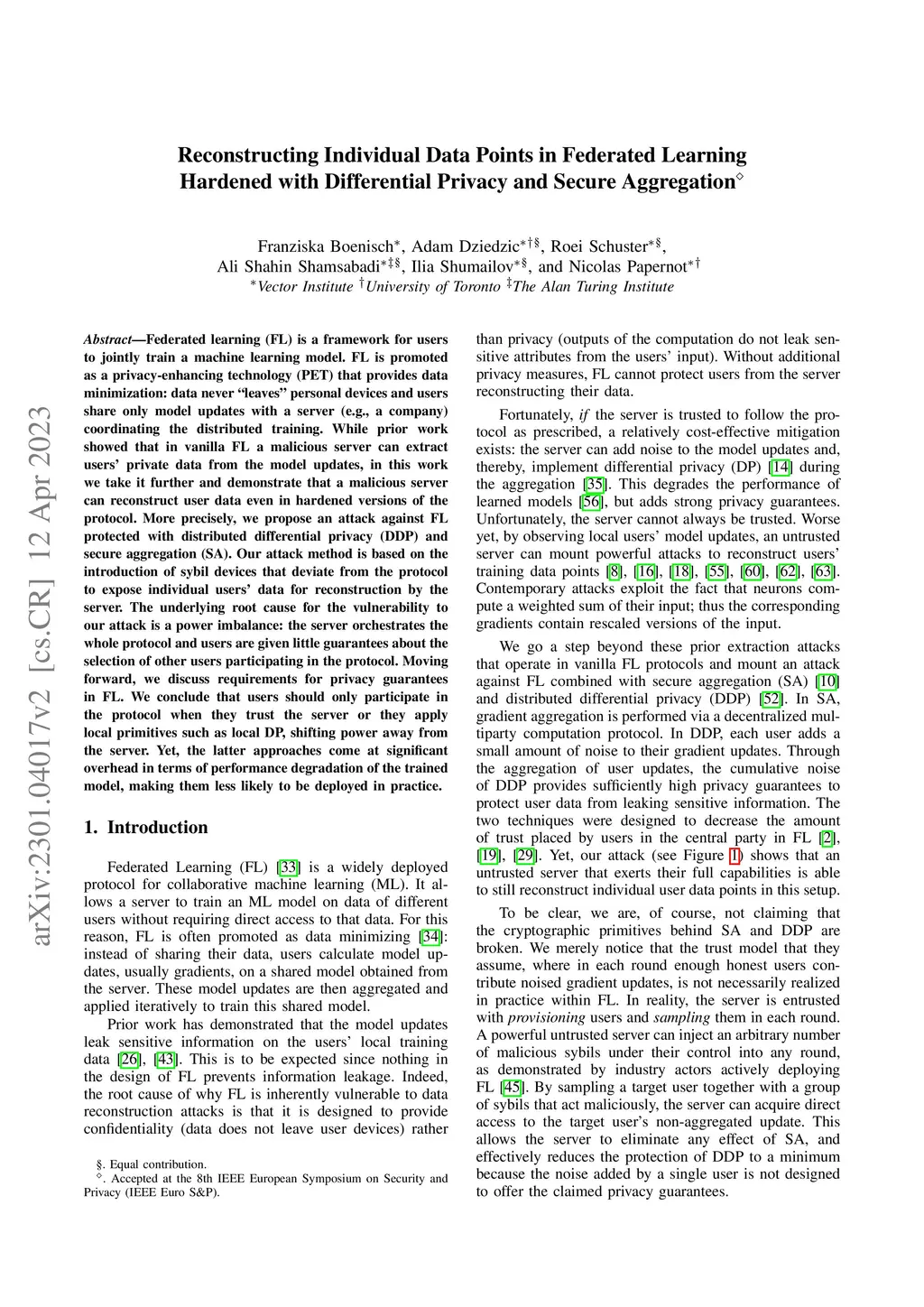 Federated learning (FL) is a framework for users to jointly train a machine learning model. FL is promoted as a privacy-enhancing technology (PET) that provides data minimization: data never "leaves" personal devices and users share only model updates with a server (e.g., a company) coordinating the distributed training. We assess the realistic (i.e., worst-case) privacy guarantees that are provided to users who are unable to trust the server. To this end, we propose an attack against FL protected with distributed differential privacy (DDP) and secure aggregation (SA). The attack method is based on the introduction of Sybil devices that deviate from the protocol to expose individual users' data for reconstruction by the server. The underlying root cause for the vulnerability to our attack is the power imbalance. The server orchestrates the whole protocol and users are given little guarantees about the selection of other users participating in the protocol. Moving forward, we discuss requirements for an FL protocol to guarantee DDP without asking users to trust the server. We conclude that such systems are not yet practical.