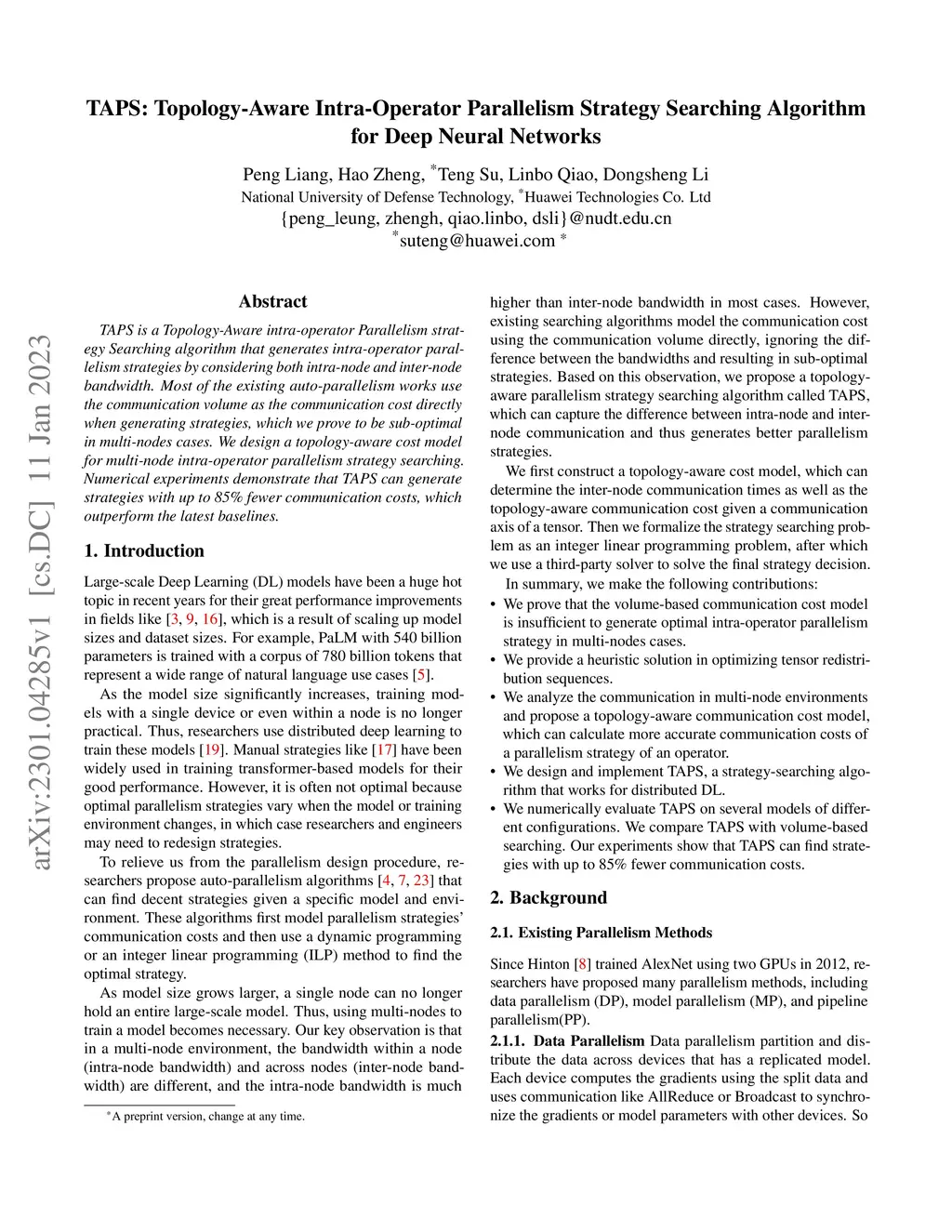 TAPS is a Topology-Aware intra-operator Parallelism strategy Searching algorithm that generates intra-operator parallelism strategies by considering both intra-node and inter-node bandwidth. Most of the existing auto-parallelism works use the communication volume as the communication cost directly when generating strategies, which we prove to be sub-optimal in multi-nodes cases. We design a topology-aware cost model for multi-node intra-operator parallelism strategy searching. Numerical experiments demonstrate that TAPS can generate strategies with up to 85% fewer communication costs, which outperform the latest baselines.