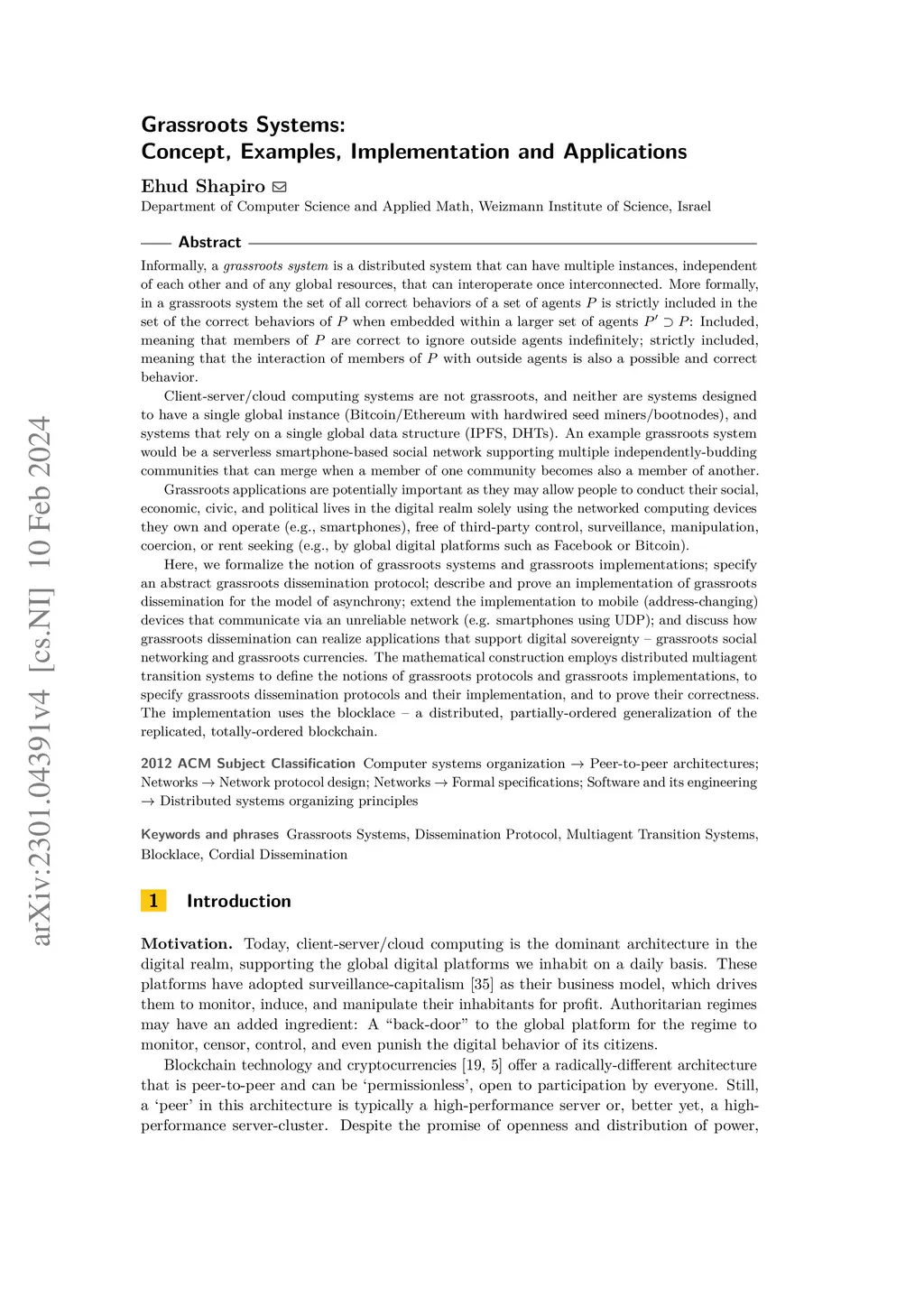 Informally, a grassroots system is a distributed system that can have multiple instances, independent of each other and of any global resources, that can interoperate once interconnected. Grassroots applications are potentially important as they may allow people to conduct their social, economic, civic, and political lives in the digital realm solely using the networked computing devices they own and operate (e.g., smartphones), free of third-party control, surveillance, manipulation, coercion, or rent seeking (e.g., by global digital platforms such as Facebook or Bitcoin). Here, we formalize the notion of grassroots systems and grassroots implementations; specify an abstract grassroots dissemination protocol; describe and prove an implementation of grassroots dissemination for the model of asynchrony; extend the implementation to mobile (address-changing) devices that communicate via an unreliable network (e.g. smartphones using UDP); and discuss how grassroots dissemination can realize applications that support digital sovereignty -- grassroots social networking and grassroots currencies. The mathematical construction employs distributed multiagent transition systems to define the notions of grassroots protocols and grassroots implementations, to specify grassroots dissemination protocols and their implementation, and to prove their correctness. The implementation uses the blocklace -- a generalization of the blockchain that functions as a fault-tolerant, conflict-free replicated data type.