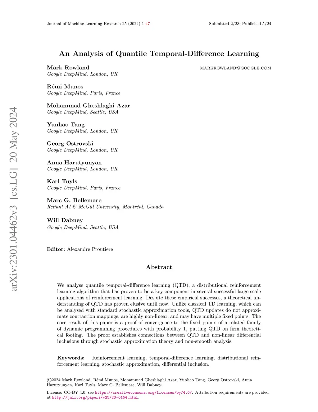 We analyse quantile temporal-difference learning (QTD), a distributional reinforcement learning algorithm that has proven to be a key component in several successful large-scale applications of reinforcement learning. Despite these empirical successes, a theoretical understanding of QTD has proven elusive until now. Unlike classical TD learning, which can be analysed with standard stochastic approximation tools, QTD updates do not approximate contraction mappings, are highly non-linear, and may have multiple fixed points. The core result of this paper is a proof of convergence to the fixed points of a related family of dynamic programming procedures with probability 1, putting QTD on firm theoretical footing. The proof establishes connections between QTD and non-linear differential inclusions through stochastic approximation theory and non-smooth analysis.