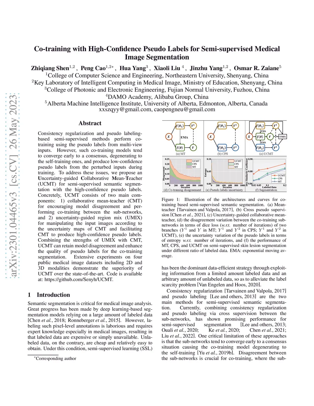 Consistency regularization and pseudo labeling-based semi-supervised methods perform co-training using the pseudo labels from multi-view inputs. However, such co-training models tend to converge early to a consensus, degenerating to the self-training ones, and produce low-confidence pseudo labels from the perturbed inputs during training. To address these issues, we propose an Uncertainty-guided Collaborative Mean-Teacher (UCMT) for semi-supervised semantic segmentation with the high-confidence pseudo labels. Concretely, UCMT consists of two main components: 1) collaborative mean-teacher (CMT) for encouraging model disagreement and performing co-training between the sub-networks, and 2) uncertainty-guided region mix (UMIX) for manipulating the input images according to the uncertainty maps of CMT and facilitating CMT to produce high-confidence pseudo labels. Combining the strengths of UMIX with CMT, UCMT can retain model disagreement and enhance the quality of pseudo labels for the co-training segmentation. Extensive experiments on four public medical image datasets including 2D and 3D modalities demonstrate the superiority of UCMT over the state-of-the-art. Code is available at: https://github.com/Senyh/UCMT.