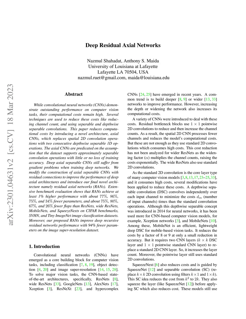 While convolutional neural networks (CNNs) demonstrate outstanding performance on computer vision tasks, their computational costs remain high. Several techniques are used to reduce these costs, like reducing channel count, and using separable and depthwise separable convolutions. This paper reduces computational costs by introducing a novel architecture, axial CNNs, which replaces spatial 2D convolution operations with two consecutive depthwise separable 1D operations. The axial CNNs are predicated on the assumption that the dataset supports approximately separable convolution operations with little or no loss of training accuracy. Deep axial separable CNNs still suffer from gradient problems when training deep networks. We modify the construction of axial separable CNNs with residual connections to improve the performance of deep axial architectures and introduce our final novel architecture namely residual axial networks (RANs). Extensive benchmark evaluation shows that RANs achieve at least 1% higher performance with about 77%, 86%, 75%, and 34% fewer parameters and about 75%, 80%, 67%, and 26% fewer flops than ResNets, wide ResNets, MobileNets, and SqueezeNexts on CIFAR benchmarks, SVHN, and Tiny ImageNet image classification datasets. Moreover, our proposed RANs improve deep recursive residual networks performance with 94% fewer parameters on the image super-resolution dataset.