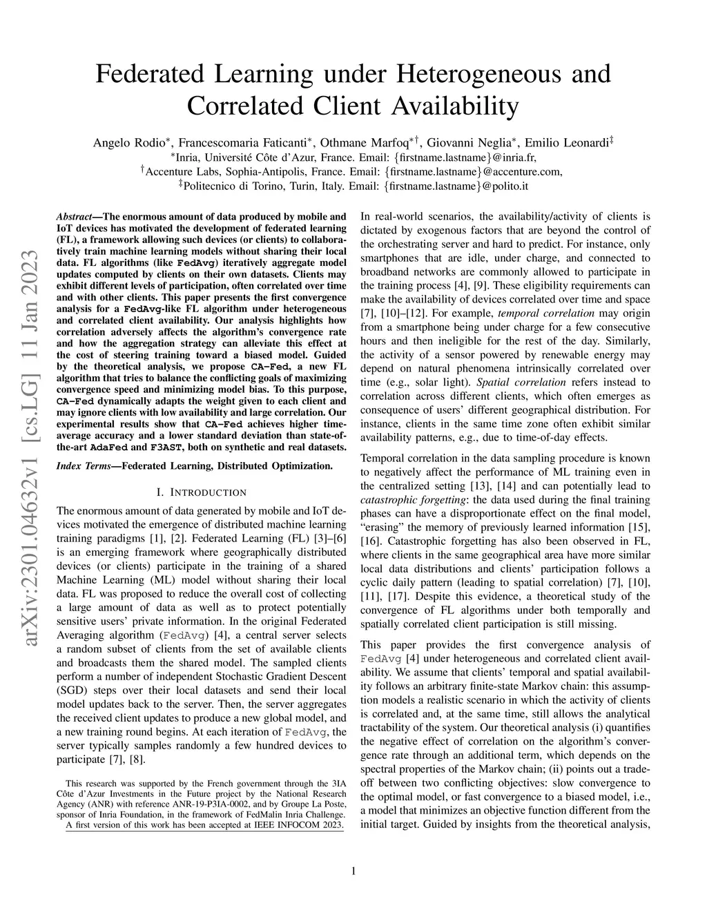 The enormous amount of data produced by mobile and IoT devices has motivated the development of federated learning (FL), a framework allowing such devices (or clients) to collaboratively train machine learning models without sharing their local data. FL algorithms (like FedAvg) iteratively aggregate model updates computed by clients on their own datasets. Clients may exhibit different levels of participation, often correlated over time and with other clients. This paper presents the first convergence analysis for a FedAvg-like FL algorithm under heterogeneous and correlated client availability. Our analysis highlights how correlation adversely affects the algorithm's convergence rate and how the aggregation strategy can alleviate this effect at the cost of steering training toward a biased model. Guided by the theoretical analysis, we propose CA-Fed, a new FL algorithm that tries to balance the conflicting goals of maximizing convergence speed and minimizing model bias. To this purpose, CA-Fed dynamically adapts the weight given to each client and may ignore clients with low availability and large correlation. Our experimental results show that CA-Fed achieves higher time-average accuracy and a lower standard deviation than state-of-the-art AdaFed and F3AST, both on synthetic and real datasets.