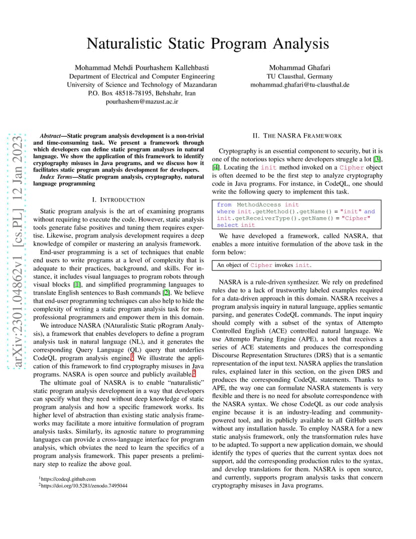 Static program analysis development is a non-trivial and time-consuming task. We present a framework through which developers can define static program analyses in natural language. We show the application of this framework to identify cryptography misuses in Java programs, and we discuss how it facilitates static program analysis development for developers.