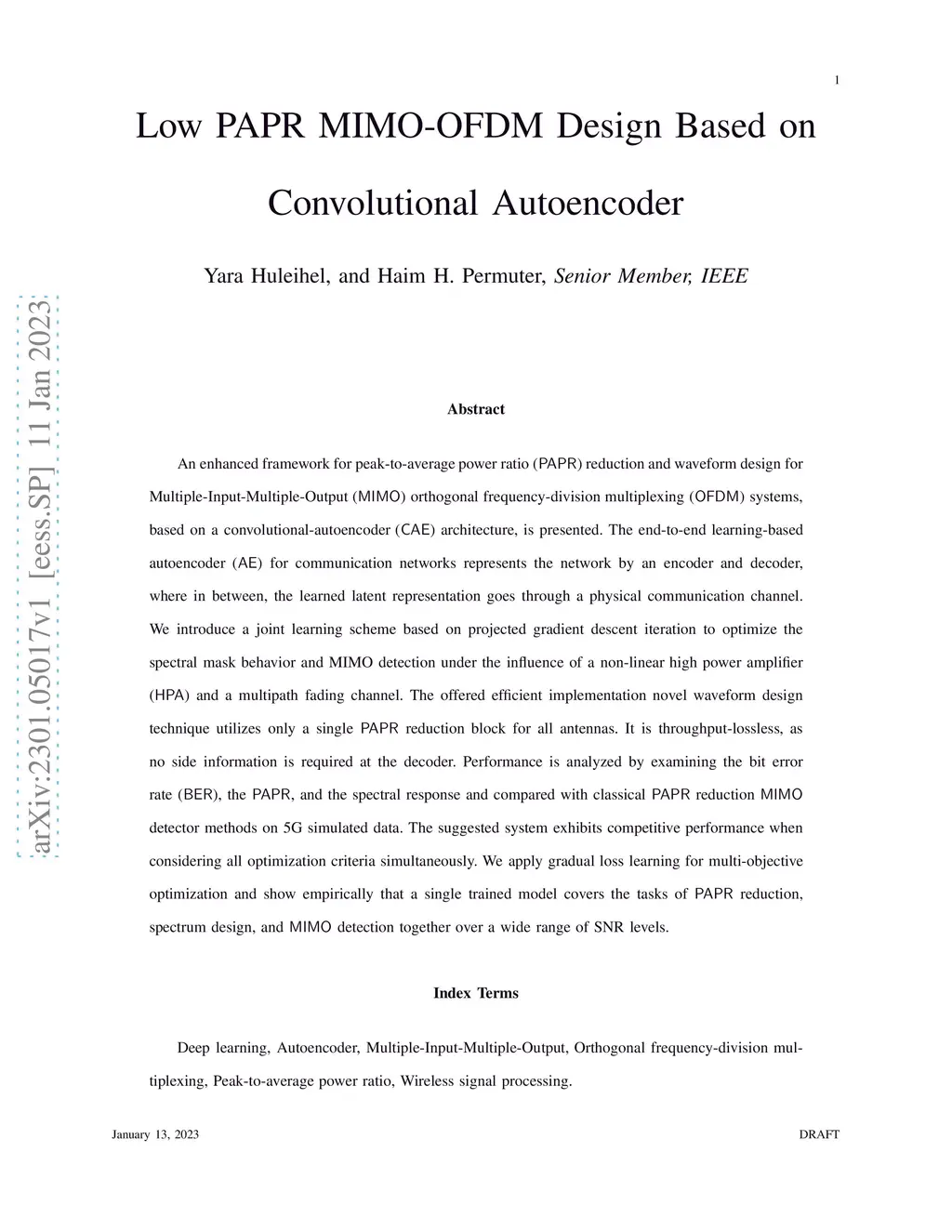 An enhanced framework for peak-to-average power ratio () reduction and waveform design for Multiple-Input-Multiple-Output () orthogonal frequency-division multiplexing () systems, based on a convolutional-autoencoder () architecture, is presented. The end-to-end learning-based autoencoder () for communication networks represents the network by an encoder and decoder, where in between, the learned latent representation goes through a physical communication channel. We introduce a joint learning scheme based on projected gradient descent iteration to optimize the spectral mask behavior and MIMO detection under the influence of a non-linear high power amplifier () and a multipath fading channel. The offered efficient implementation novel waveform design technique utilizes only a single reduction block for all antennas. It is throughput-lossless, as no side information is required at the decoder. Performance is analyzed by examining the bit error rate (), the , and the spectral response and compared with classical reduction detector methods on 5G simulated data. The suggested system exhibits competitive performance when considering all optimization criteria simultaneously. We apply gradual loss learning for multi-objective optimization and show empirically that a single trained model covers the tasks of reduction, spectrum design, and detection together over a wide range of SNR levels.