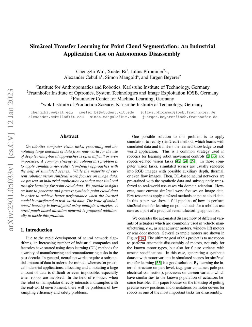 On robotics computer vision tasks, generating and annotating large amounts of data from real-world for the use of deep learning-based approaches is often difficult or even impossible. A common strategy for solving this problem is to apply simulation-to-reality (sim2real) approaches with the help of simulated scenes. While the majority of current robotics vision sim2real work focuses on image data, we present an industrial application case that uses sim2real transfer learning for point cloud data. We provide insights on how to generate and process synthetic point cloud data in order to achieve better performance when the learned model is transferred to real-world data. The issue of imbalanced learning is investigated using multiple strategies. A novel patch-based attention network is proposed additionally to tackle this problem.