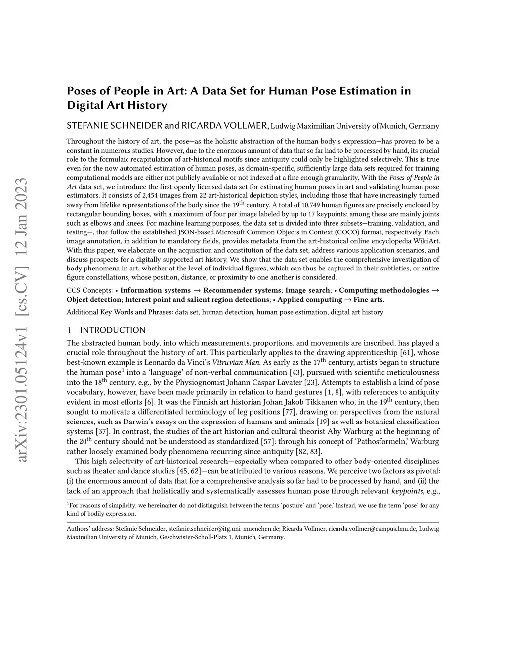 Throughout the history of art, the pose, as the holistic abstraction of the human body's expression, has proven to be a constant in numerous studies. However, due to the enormous amount of data that so far had to be processed by hand, its crucial role to the formulaic recapitulation of art-historical motifs since antiquity could only be highlighted selectively. This is true even for the now automated estimation of human poses, as domain-specific, sufficiently large data sets required for training computational models are either not publicly available or not indexed at a fine enough granularity. With the Poses of People in Art data set, we introduce the first openly licensed data set for estimating human poses in art and validating human pose estimators. It consists of 2,454 images from 22 art-historical depiction styles, including those that have increasingly turned away from lifelike representations of the body since the 19th century. A total of 10,749 human figures are precisely enclosed by rectangular bounding boxes, with a maximum of four per image labeled by up to 17 keypoints; among these are mainly joints such as elbows and knees. For machine learning purposes, the data set is divided into three subsets, training, validation, and testing, that follow the established JSON-based Microsoft COCO format, respectively. Each image annotation, in addition to mandatory fields, provides metadata from the art-historical online encyclopedia WikiArt. With this paper, we elaborate on the acquisition and constitution of the data set, address various application scenarios, and discuss prospects for a digitally supported art history. We show that the data set enables the investigation of body phenomena in art, whether at the level of individual figures, which can be captured in their subtleties, or entire figure constellations, whose position, distance, or proximity to one another is considered.