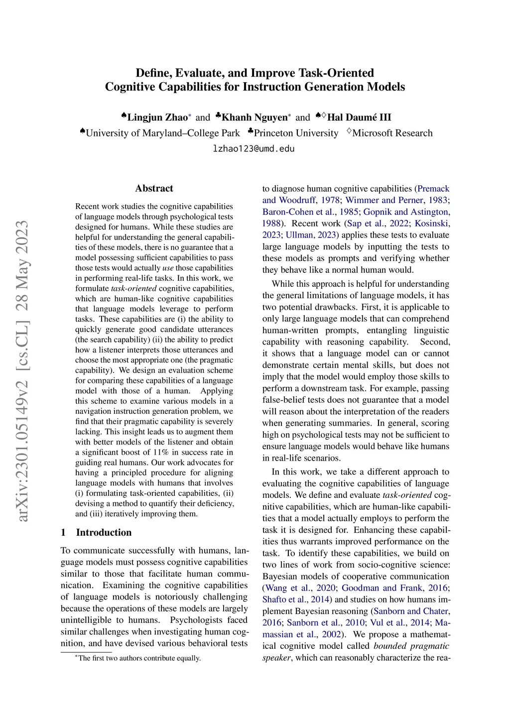 Recent work studies the cognitive capabilities of language models through psychological tests designed for humans. While these studies are helpful for understanding the general capabilities of these models, there is no guarantee that a model possessing sufficient capabilities to pass those tests would actually use those capabilities in performing real-life tasks. In this work, we formulate task-oriented cognitive capabilities, which are human-like cognitive capabilities that language models leverage to perform tasks. These capabilities are (i) the ability to quickly generate good candidate utterances (the search capability) (ii) the ability to predict how a listener interprets those utterances and choose the most appropriate one (the pragmatic capability). We design an evaluation scheme for comparing these capabilities of a language model with those of a human. Applying this scheme to examine various models in a navigation instruction generation problem, we find that their pragmatic capability is severely lacking. This insight leads us to augment them with better models of the listener and obtain a significant boost of 11% in success rate in guiding real humans. Our work advocates for having a principled procedure for aligning language models with humans that involves (i) formulating task-oriented capabilities, (ii) devising a method to quantify their deficiency, and (iii) iteratively improving them.