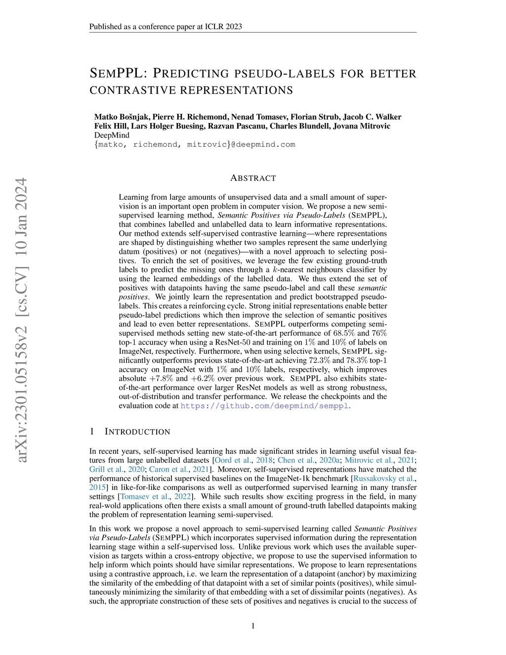 Learning from large amounts of unsupervised data and a small amount of supervision is an important open problem in computer vision. We propose a new semi-supervised learning method, Semantic Positives via Pseudo-Labels (SemPPL), that combines labelled and unlabelled data to learn informative representations. Our method extends self-supervised contrastive learning -- where representations are shaped by distinguishing whether two samples represent the same underlying datum (positives) or not (negatives) -- with a novel approach to selecting positives. To enrich the set of positives, we leverage the few existing ground-truth labels to predict the missing ones through a -nearest neighbours classifier by using the learned embeddings of the labelled data. We thus extend the set of positives with datapoints having the same pseudo-label and call these semantic positives. We jointly learn the representation and predict bootstrapped pseudo-labels. This creates a reinforcing cycle. Strong initial representations enable better pseudo-label predictions which then improve the selection of semantic positives and lead to even better representations. SemPPL outperforms competing semi-supervised methods setting new state-of-the-art performance of and top- accuracy when using a ResNet- and training on and of labels on ImageNet, respectively. Furthermore, when using selective kernels, SemPPL significantly outperforms previous state-of-the-art achieving and top- accuracy on ImageNet with and labels, respectively, which improves absolute and over previous work. SemPPL also exhibits state-of-the-art performance over larger ResNet models as well as strong robustness, out-of-distribution and transfer performance. We release the checkpoints and the evaluation code at https://github.com/deepmind/semppl .