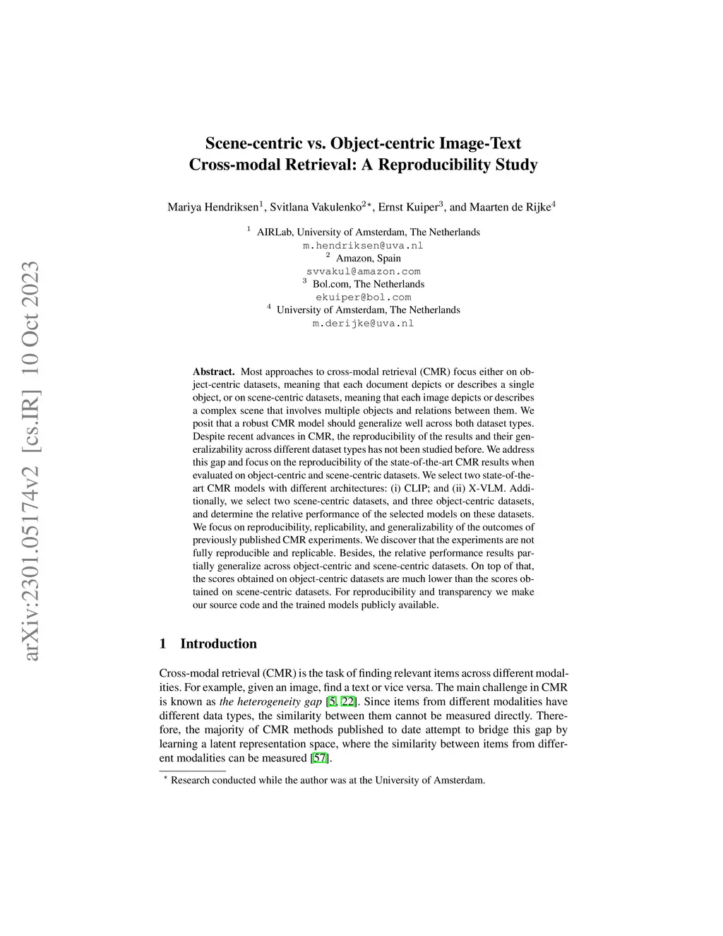 Most approaches to cross-modal retrieval (CMR) focus either on object-centric datasets, meaning that each document depicts or describes a single object, or on scene-centric datasets, meaning that each image depicts or describes a complex scene that involves multiple objects and relations between them. We posit that a robust CMR model should generalize well across both dataset types. Despite recent advances in CMR, the reproducibility of the results and their generalizability across different dataset types has not been studied before. We address this gap and focus on the reproducibility of the state-of-the-art CMR results when evaluated on object-centric and scene-centric datasets. We select two state-of-the-art CMR models with different architectures: (i) CLIP; and (ii) X-VLM. Additionally, we select two scene-centric datasets, and three object-centric datasets, and determine the relative performance of the selected models on these datasets. We focus on reproducibility, replicability, and generalizability of the outcomes of previously published CMR experiments. We discover that the experiments are not fully reproducible and replicable. Besides, the relative performance results partially generalize across object-centric and scene-centric datasets. On top of that, the scores obtained on object-centric datasets are much lower than the scores obtained on scene-centric datasets. For reproducibility and transparency we make our source code and the trained models publicly available.