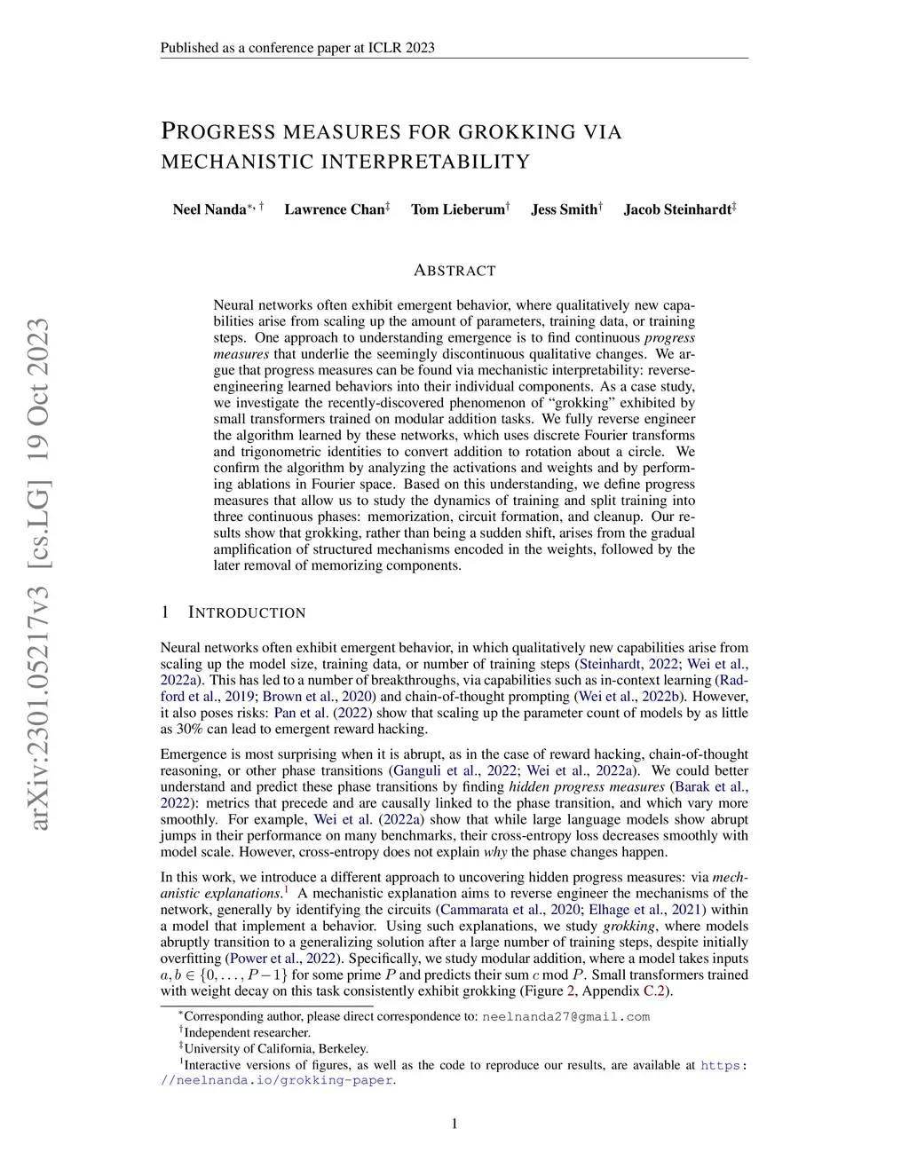 Neural networks often exhibit emergent behavior, where qualitatively new capabilities arise from scaling up the amount of parameters, training data, or training steps. One approach to understanding emergence is to find continuous \textit{progress measures} that underlie the seemingly discontinuous qualitative changes. We argue that progress measures can be found via mechanistic interpretability: reverse-engineering learned behaviors into their individual components. As a case study, we investigate the recently-discovered phenomenon of ``grokking'' exhibited by small transformers trained on modular addition tasks. We fully reverse engineer the algorithm learned by these networks, which uses discrete Fourier transforms and trigonometric identities to convert addition to rotation about a circle. We confirm the algorithm by analyzing the activations and weights and by performing ablations in Fourier space. Based on this understanding, we define progress measures that allow us to study the dynamics of training and split training into three continuous phases: memorization, circuit formation, and cleanup. Our results show that grokking, rather than being a sudden shift, arises from the gradual amplification of structured mechanisms encoded in the weights, followed by the later removal of memorizing components.
