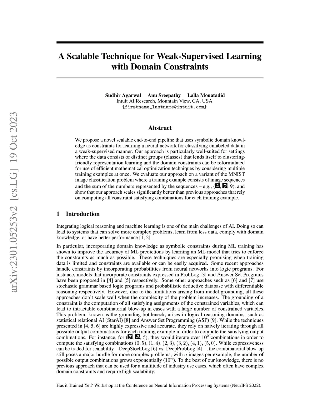 We propose a novel scalable end-to-end pipeline that uses symbolic domain knowledge as constraints for learning a neural network for classifying unlabeled data in a weak-supervised manner. Our approach is particularly well-suited for settings where the data consists of distinct groups (classes) that lends itself to clustering-friendly representation learning and the domain constraints can be reformulated for use of efficient mathematical optimization techniques by considering multiple training examples at once. We evaluate our approach on a variant of the MNIST image classification problem where a training example consists of image sequences and the sum of the numbers represented by the sequences, and show that our approach scales significantly better than previous approaches that rely on computing all constraint satisfying combinations for each training example.