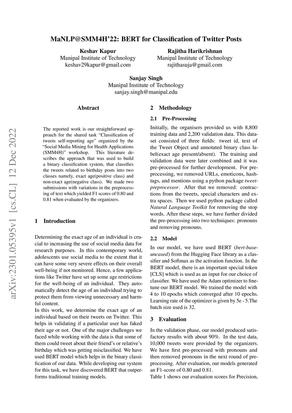 MaNLP@SMM4H22: BERT for Classification of Twitter Posts