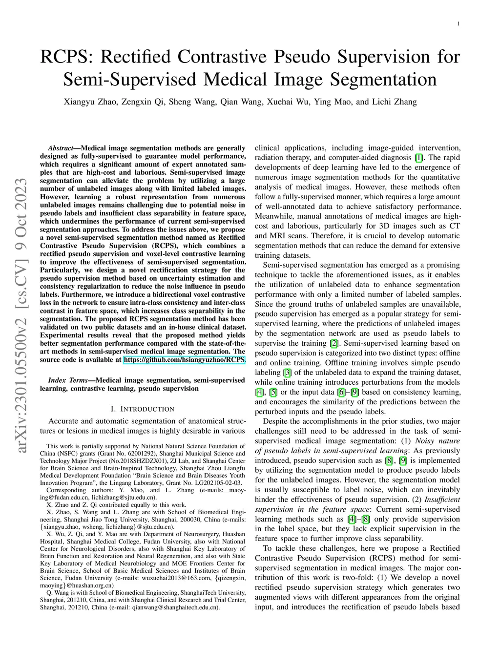 Medical image segmentation methods are generally designed as fully-supervised to guarantee model performance, which require a significant amount of expert annotated samples that are high-cost and laborious. Semi-supervised image segmentation can alleviate the problem by utilizing a large number of unlabeled images along with limited labeled images. However, learning a robust representation from numerous unlabeled images remains challenging due to potential noise in pseudo labels and insufficient class separability in feature space, which undermines the performance of current semi-supervised segmentation approaches. To address the issues above, we propose a novel semi-supervised segmentation method named as Rectified Contrastive Pseudo Supervision (RCPS), which combines a rectified pseudo supervision and voxel-level contrastive learning to improve the effectiveness of semi-supervised segmentation. Particularly, we design a novel rectification strategy for the pseudo supervision method based on uncertainty estimation and consistency regularization to reduce the noise influence in pseudo labels. Furthermore, we introduce a bidirectional voxel contrastive loss to the network to ensure intra-class consistency and inter-class contrast in feature space, which increases class separability in the segmentation. The proposed RCPS segmentation method has been validated on two public datasets and an in-house clinical dataset. Experimental results reveal that the proposed method yields better segmentation performance compared with the state-of-the-art methods in semi-supervised medical image segmentation. The source code is available at https://github.com/hsiangyuzhao/RCPS.