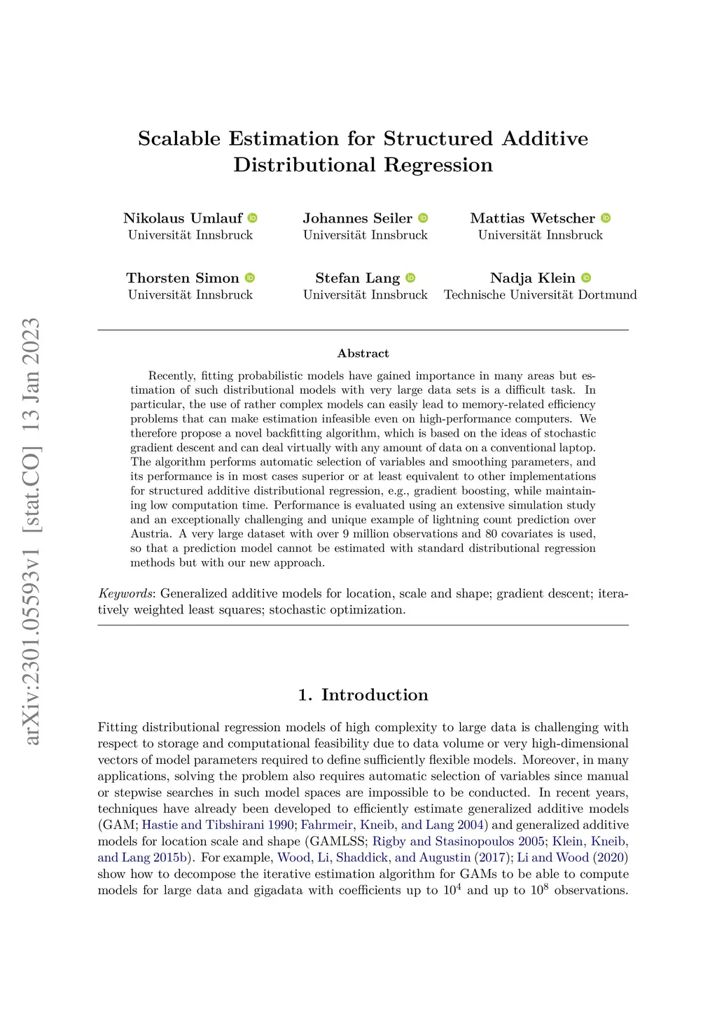 Recently, fitting probabilistic models have gained importance in many areas but estimation of such distributional models with very large data sets is a difficult task. In particular, the use of rather complex models can easily lead to memory-related efficiency problems that can make estimation infeasible even on high-performance computers. We therefore propose a novel backfitting algorithm, which is based on the ideas of stochastic gradient descent and can deal virtually with any amount of data on a conventional laptop. The algorithm performs automatic selection of variables and smoothing parameters, and its performance is in most cases superior or at least equivalent to other implementations for structured additive distributional regression, e.g., gradient boosting, while maintaining low computation time. Performance is evaluated using an extensive simulation study and an exceptionally challenging and unique example of lightning count prediction over Austria. A very large dataset with over 9 million observations and 80 covariates is used, so that a prediction model cannot be estimated with standard distributional regression methods but with our new approach.