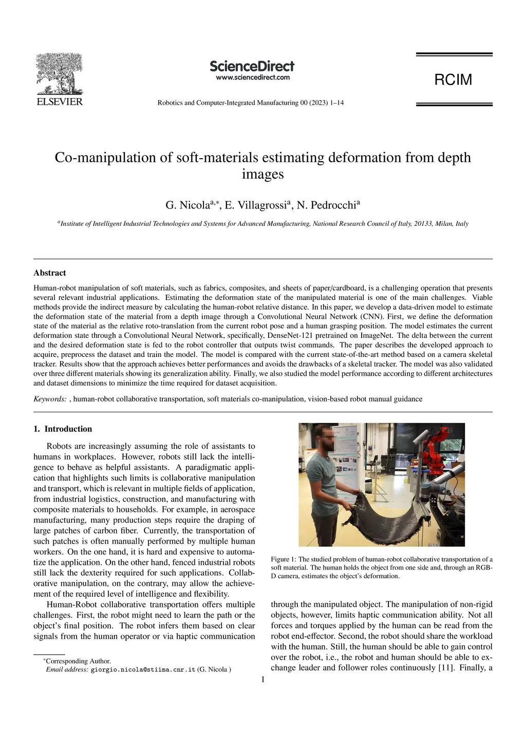 Human-robot co-manipulation of soft materials, such as fabrics, composites, and sheets of paper/cardboard, is a challenging operation that presents several relevant industrial applications. Estimating the deformation state of the co-manipulated material is one of the main challenges. Viable methods provide the indirect measure by calculating the human-robot relative distance. In this paper, we develop a data-driven model to estimate the deformation state of the material from a depth image through a Convolutional Neural Network (CNN). First, we define the deformation state of the material as the relative roto-translation from the current robot pose and a human grasping position. The model estimates the current deformation state through a Convolutional Neural Network, specifically a DenseNet-121 pretrained on ImageNet.The delta between the current and the desired deformation state is fed to the robot controller that outputs twist commands. The paper describes the developed approach to acquire, preprocess the dataset and train the model. The model is compared with the current state-of-the-art method based on a skeletal tracker from cameras. Results show that our approach achieves better performances and avoids the various drawbacks caused by using a skeletal tracker.Finally, we also studied the model performance according to different architectures and dataset dimensions to minimize the time required for dataset acquisition
