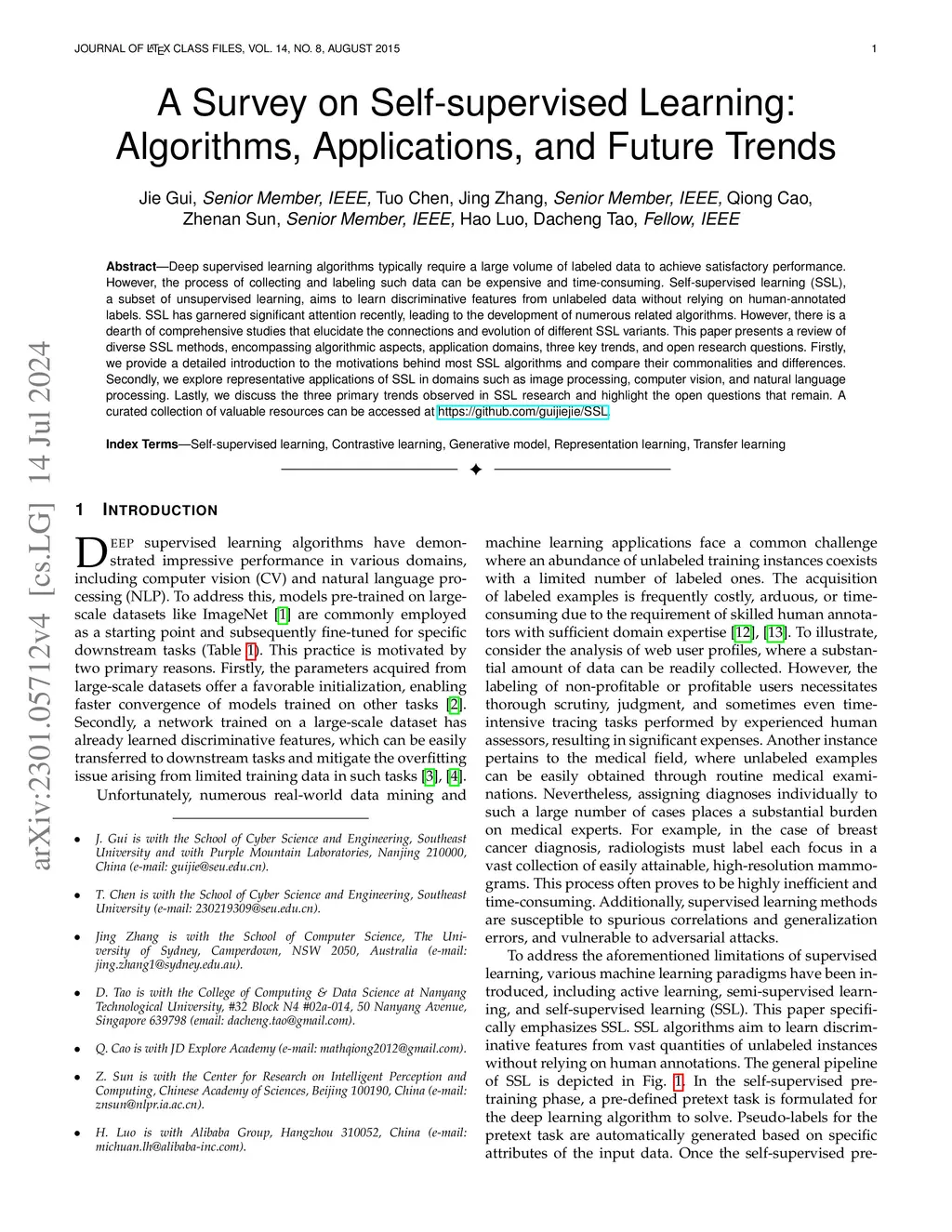 Deep supervised learning algorithms typically require a large volume of labeled data to achieve satisfactory performance. However, the process of collecting and labeling such data can be expensive and time-consuming. Self-supervised learning (SSL), a subset of unsupervised learning, aims to learn discriminative features from unlabeled data without relying on human-annotated labels. SSL has garnered significant attention recently, leading to the development of numerous related algorithms. However, there is a dearth of comprehensive studies that elucidate the connections and evolution of different SSL variants. This paper presents a review of diverse SSL methods, encompassing algorithmic aspects, application domains, three key trends, and open research questions. Firstly, we provide a detailed introduction to the motivations behind most SSL algorithms and compare their commonalities and differences. Secondly, we explore representative applications of SSL in domains such as image processing, computer vision, and natural language processing. Lastly, we discuss the three primary trends observed in SSL research and highlight the open questions that remain. A curated collection of valuable resources can be accessed at https://github.com/guijiejie/SSL.