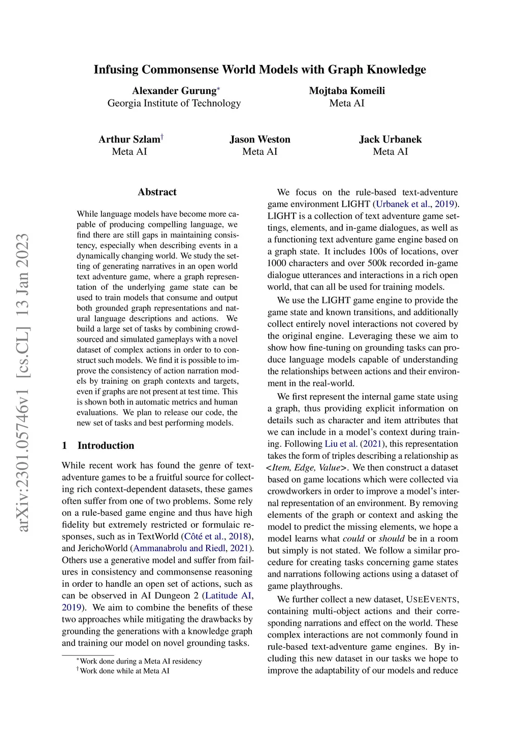 While language models have become more capable of producing compelling language, we find there are still gaps in maintaining consistency, especially when describing events in a dynamically changing world. We study the setting of generating narratives in an open world text adventure game, where a graph representation of the underlying game state can be used to train models that consume and output both grounded graph representations and natural language descriptions and actions. We build a large set of tasks by combining crowdsourced and simulated gameplays with a novel dataset of complex actions in order to to construct such models. We find it is possible to improve the consistency of action narration models by training on graph contexts and targets, even if graphs are not present at test time. This is shown both in automatic metrics and human evaluations. We plan to release our code, the new set of tasks, and best performing models.