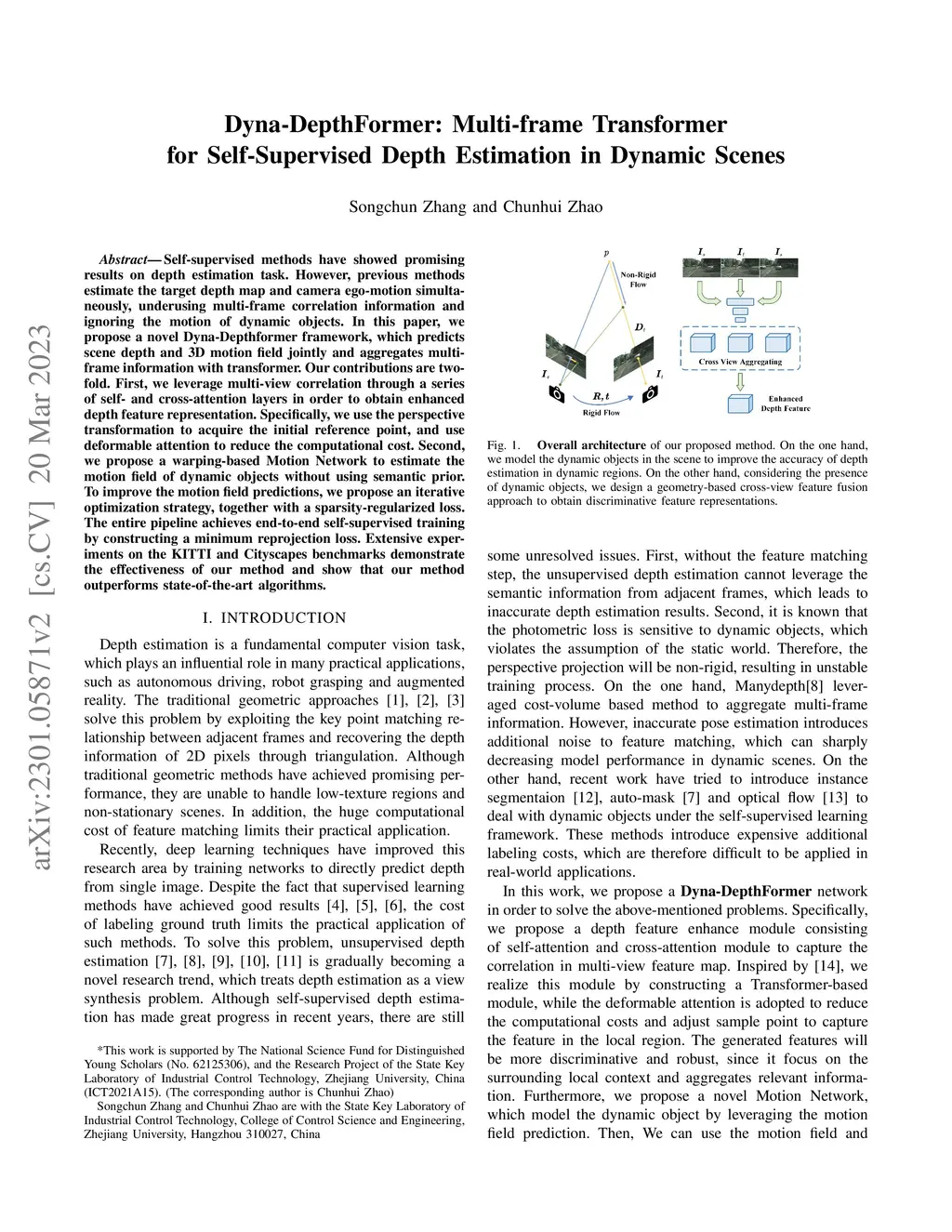 Self-supervised methods have showed promising results on depth estimation task. However, previous methods estimate the target depth map and camera ego-motion simultaneously, underusing multi-frame correlation information and ignoring the motion of dynamic objects. In this paper, we propose a novel Dyna-Depthformer framework, which predicts scene depth and 3D motion field jointly and aggregates multi-frame information with transformer. Our contributions are two-fold. First, we leverage multi-view correlation through a series of self- and cross-attention layers in order to obtain enhanced depth feature representation. Specifically, we use the perspective transformation to acquire the initial reference point, and use deformable attention to reduce the computational cost. Second, we propose a warping-based Motion Network to estimate the motion field of dynamic objects without using semantic prior. To improve the motion field predictions, we propose an iterative optimization strategy, together with a sparsity-regularized loss. The entire pipeline achieves end-to-end self-supervised training by constructing a minimum reprojection loss. Extensive experiments on the KITTI and Cityscapes benchmarks demonstrate the effectiveness of our method and show that our method outperforms state-of-the-art algorithms.