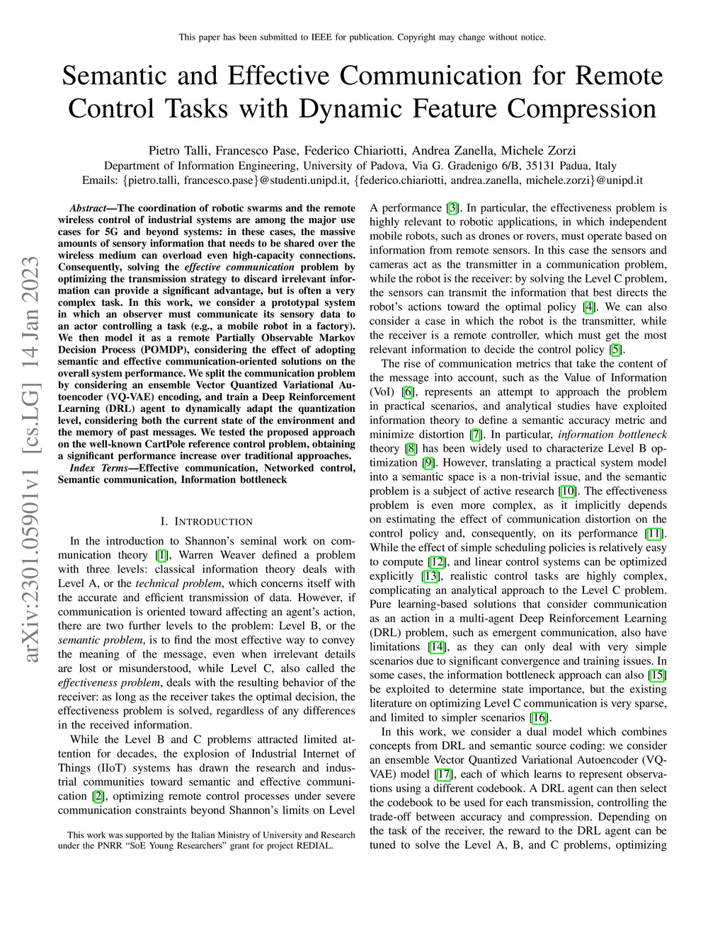 The coordination of robotic swarms and the remote wireless control of industrial systems are among the major use cases for 5G and beyond systems: in these cases, the massive amounts of sensory information that needs to be shared over the wireless medium can overload even high-capacity connections. Consequently, solving the effective communication problem by optimizing the transmission strategy to discard irrelevant information can provide a significant advantage, but is often a very complex task. In this work, we consider a prototypal system in which an observer must communicate its sensory data to an actor controlling a task (e.g., a mobile robot in a factory). We then model it as a remote Partially Observable Markov Decision Process (POMDP), considering the effect of adopting semantic and effective communication-oriented solutions on the overall system performance. We split the communication problem by considering an ensemble Vector Quantized Variational Autoencoder (VQ-VAE) encoding, and train a Deep Reinforcement Learning (DRL) agent to dynamically adapt the quantization level, considering both the current state of the environment and the memory of past messages. We tested the proposed approach on the well-known CartPole reference control problem, obtaining a significant performance increase over traditional approaches