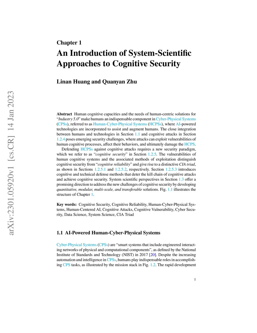 Human cognitive capacities and the needs of human-centric solutions for "Industry 5.0" make humans an indispensable component in Cyber-Physical Systems (CPSs), referred to as Human-Cyber-Physical Systems (HCPSs), where AI-powered technologies are incorporated to assist and augment humans. The close integration between humans and technologies in Section 1.1 and cognitive attacks in Section 1.2.4 poses emerging security challenges, where attacks can exploit vulnerabilities of human cognitive processes, affect their behaviors, and ultimately damage the HCPS. Defending HCPSs against cognitive attacks requires a new security paradigm, which we refer to as "cognitive security" in Section 1.2.5. The vulnerabilities of human cognitive systems and the associated methods of exploitation distinguish cognitive security from "cognitive reliability" and give rise to a distinctive CIA triad, as shown in Sections 1.2.5.1 and 1.2.5.2, respectively. Section 1.2.5.3 introduces cognitive and technical defense methods that deter the kill chain of cognitive attacks and achieve cognitive security. System scientific perspectives in Section 1.3 offer a promising direction to address the new challenges of cognitive security by developing quantitative, modular, multi-scale, and transferable solutions.