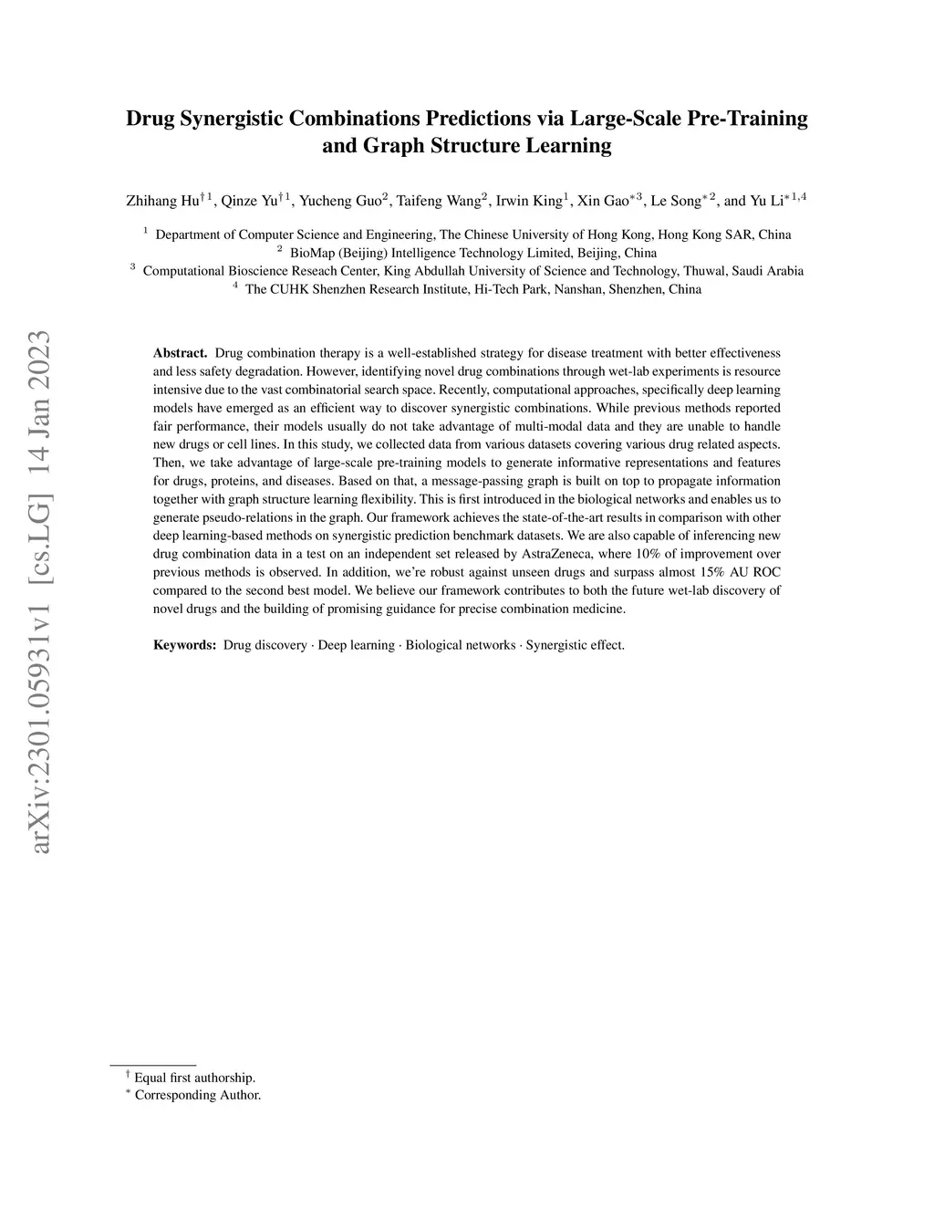 Drug combination therapy is a well-established strategy for disease treatment with better effectiveness and less safety degradation. However, identifying novel drug combinations through wet-lab experiments is resource intensive due to the vast combinatorial search space. Recently, computational approaches, specifically deep learning models have emerged as an efficient way to discover synergistic combinations. While previous methods reported fair performance, their models usually do not take advantage of multi-modal data and they are unable to handle new drugs or cell lines. In this study, we collected data from various datasets covering various drug-related aspects. Then, we take advantage of large-scale pre-training models to generate informative representations and features for drugs, proteins, and diseases. Based on that, a message-passing graph is built on top to propagate information together with graph structure learning flexibility. This is first introduced in the biological networks and enables us to generate pseudo-relations in the graph. Our framework achieves state-of-the-art results in comparison with other deep learning-based methods on synergistic prediction benchmark datasets. We are also capable of inferencing new drug combination data in a test on an independent set released by AstraZeneca, where 10% of improvement over previous methods is observed. In addition, we're robust against unseen drugs and surpass almost 15% AU ROC compared to the second-best model. We believe our framework contributes to both the future wet-lab discovery of novel drugs and the building of promising guidance for precise combination medicine.