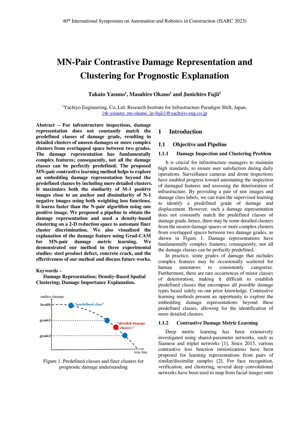 For infrastructure inspections, damage representation does not constantly match the predefined classes of damage grade, resulting in detailed clusters of unseen damages or more complex clusters from overlapped space between two grades. The damage representation has fundamentally complex features; consequently, not all the damage classes can be perfectly predefined. The proposed MN-pair contrastive learning method helps to explore an embedding damage representation beyond the predefined classes by including more detailed clusters. It maximizes both the similarity of M-1 positive images close to an anchor and dissimilarity of N-1 negative images using both weighting loss functions. It learns faster than the N-pair algorithm using one positive image. We proposed a pipeline to obtain the damage representation and used a density-based clustering on a 2-D reduction space to automate finer cluster discrimination. We also visualized the explanation of the damage feature using Grad-CAM for MN-pair damage metric learning. We demonstrated our method in three experimental studies: steel product defect, concrete crack, and the effectiveness of our method and discuss future works.