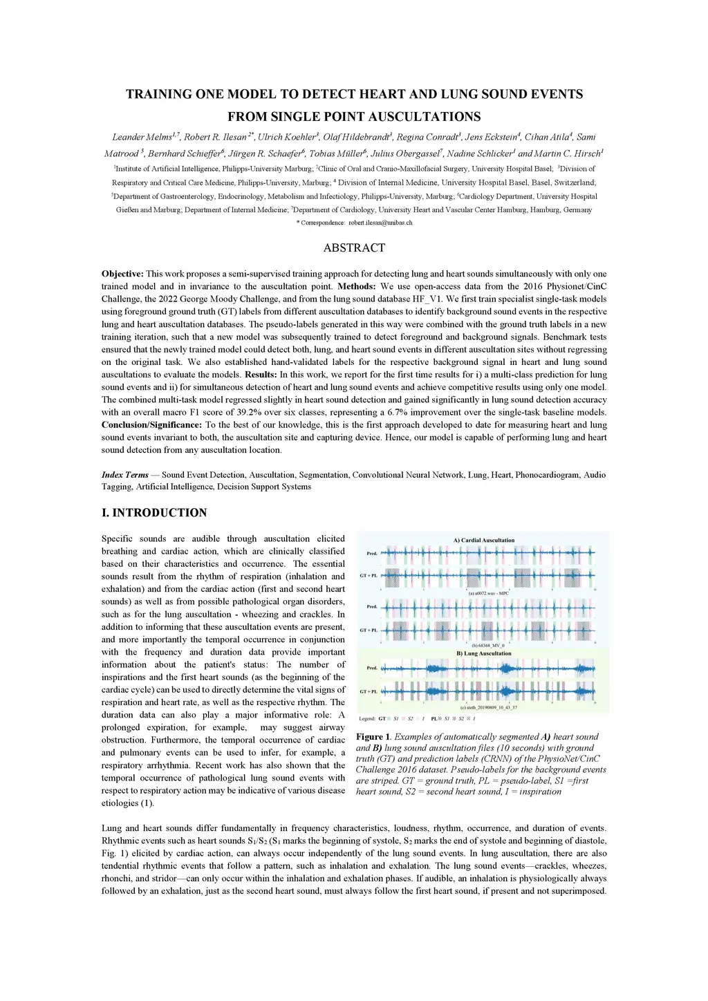 Objective: This work proposes a semi-supervised training approach for detecting lung and heart sounds simultaneously with only one trained model and in invariance to the auscultation point. Methods: We use open-access data from the 2016 Physionet/CinC Challenge, the 2022 George Moody Challenge, and from the lung sound database HF_V1. We first train specialist single-task models using foreground ground truth (GT) labels from different auscultation databases to identify background sound events in the respective lung and heart auscultation databases. The pseudo-labels generated in this way were combined with the ground truth labels in a new training iteration, such that a new model was subsequently trained to detect foreground and background signals. Benchmark tests ensured that the newly trained model could detect both, lung, and heart sound events in different auscultation sites without regressing on the original task. We also established hand-validated labels for the respective background signal in heart and lung sound auscultations to evaluate the models. Results: In this work, we report for the first time results for i) a multi-class prediction for lung sound events and ii) for simultaneous detection of heart and lung sound events and achieve competitive results using only one model. The combined multi-task model regressed slightly in heart sound detection and gained significantly in lung sound detection accuracy with an overall macro F1 score of 39.2% over six classes, representing a 6.7% improvement over the single-task baseline models. Conclusion/Significance: To the best of our knowledge, this is the first approach developed to date for measuring heart and lung sound events invariant to both, the auscultation site and capturing device. Hence, our model is capable of performing lung and heart sound detection from any auscultation location.