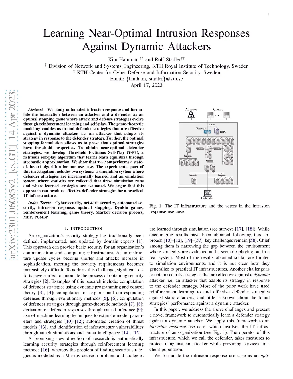 We study automated intrusion response and formulate the interaction between an attacker and a defender as an optimal stopping game where attack and defense strategies evolve through reinforcement learning and self-play. The game-theoretic modeling enables us to find defender strategies that are effective against a dynamic attacker, i.e. an attacker that adapts its strategy in response to the defender strategy. Further, the optimal stopping formulation allows us to prove that optimal strategies have threshold properties. To obtain near-optimal defender strategies, we develop Threshold Fictitious Self-Play (T-FP), a fictitious self-play algorithm that learns Nash equilibria through stochastic approximation. We show that T-FP outperforms a state-of-the-art algorithm for our use case. The experimental part of this investigation includes two systems: a simulation system where defender strategies are incrementally learned and an emulation system where statistics are collected that drive simulation runs and where learned strategies are evaluated. We argue that this approach can produce effective defender strategies for a practical IT infrastructure.