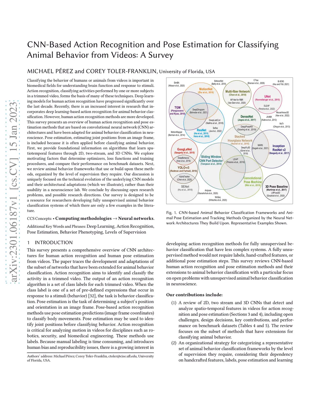 Classifying the behavior of humans or animals from videos is important in biomedical fields for understanding brain function and response to stimuli. Action recognition, classifying activities performed by one or more subjects in a trimmed video, forms the basis of many of these techniques. Deep learning models for human action recognition have progressed significantly over the last decade. Recently, there is an increased interest in research that incorporates deep learning-based action recognition for animal behavior classification. However, human action recognition methods are more developed. This survey presents an overview of human action recognition and pose estimation methods that are based on convolutional neural network (CNN) architectures and have been adapted for animal behavior classification in neuroscience. Pose estimation, estimating joint positions from an image frame, is included because it is often applied before classifying animal behavior. First, we provide foundational information on algorithms that learn spatiotemporal features through 2D, two-stream, and 3D CNNs. We explore motivating factors that determine optimizers, loss functions and training procedures, and compare their performance on benchmark datasets. Next, we review animal behavior frameworks that use or build upon these methods, organized by the level of supervision they require. Our discussion is uniquely focused on the technical evolution of the underlying CNN models and their architectural adaptations (which we illustrate), rather than their usability in a neuroscience lab. We conclude by discussing open research problems, and possible research directions. Our survey is designed to be a resource for researchers developing fully unsupervised animal behavior classification systems of which there are only a few examples in the literature.