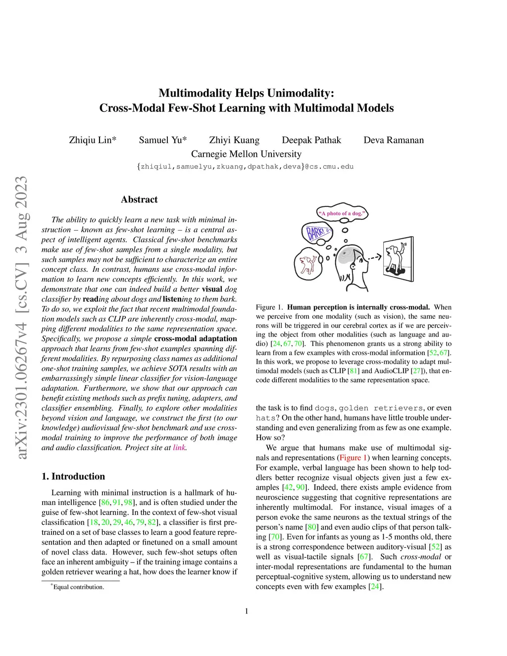 The ability to quickly learn a new task with minimal instruction - known as few-shot learning - is a central aspect of intelligent agents. Classical few-shot benchmarks make use of few-shot samples from a single modality, but such samples may not be sufficient to characterize an entire concept class. In contrast, humans use cross-modal information to learn new concepts efficiently. In this work, we demonstrate that one can indeed build a better dog classifier by ing about dogs and ing to them bark. To do so, we exploit the fact that recent multimodal foundation models such as CLIP are inherently cross-modal, mapping different modalities to the same representation space. Specifically, we propose a simple cross-modal adaptation approach that learns from few-shot examples spanning different modalities. By repurposing class names as additional one-shot training samples, we achieve SOTA results with an embarrassingly simple linear classifier for vision-language adaptation. Furthermore, we show that our approach can benefit existing methods such as prefix tuning, adapters, and classifier ensembling. Finally, to explore other modalities beyond vision and language, we construct the first (to our knowledge) audiovisual few-shot benchmark and use cross-modal training to improve the performance of both image and audio classification.