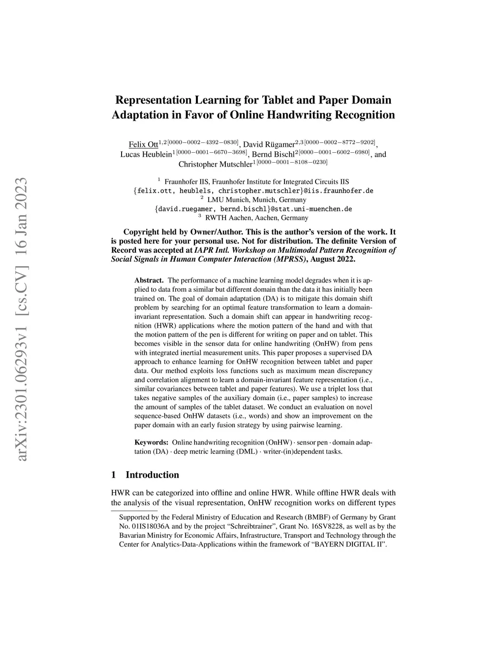 The performance of a machine learning model degrades when it is applied to data from a similar but different domain than the data it has initially been trained on. The goal of domain adaptation (DA) is to mitigate this domain shift problem by searching for an optimal feature transformation to learn a domain-invariant representation. Such a domain shift can appear in handwriting recognition (HWR) applications where the motion pattern of the hand and with that the motion pattern of the pen is different for writing on paper and on tablet. This becomes visible in the sensor data for online handwriting (OnHW) from pens with integrated inertial measurement units. This paper proposes a supervised DA approach to enhance learning for OnHW recognition between tablet and paper data. Our method exploits loss functions such as maximum mean discrepancy and correlation alignment to learn a domain-invariant feature representation (i.e., similar covariances between tablet and paper features). We use a triplet loss that takes negative samples of the auxiliary domain (i.e., paper samples) to increase the amount of samples of the tablet dataset. We conduct an evaluation on novel sequence-based OnHW datasets (i.e., words) and show an improvement on the paper domain with an early fusion strategy by using pairwise learning.
