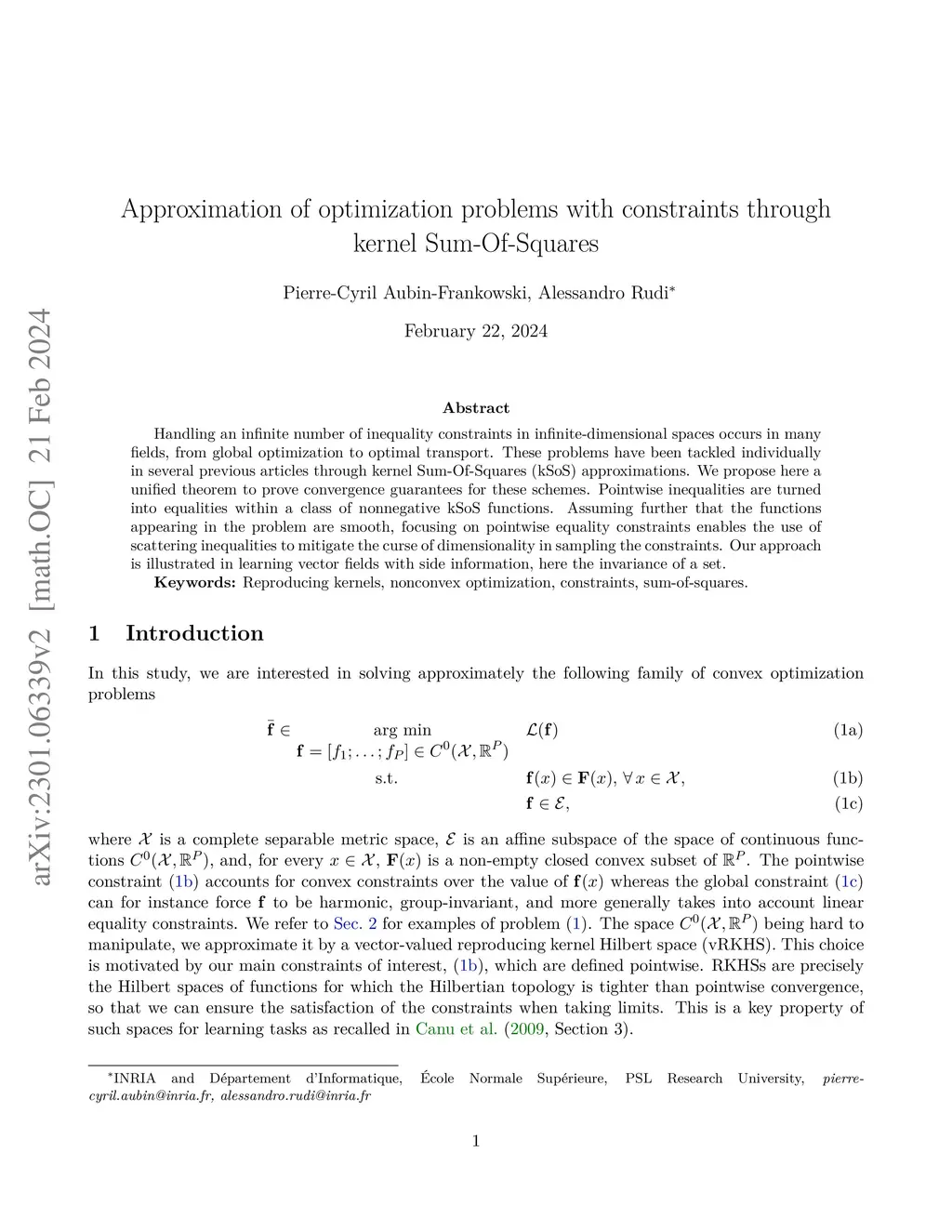 Handling an infinite number of inequality constraints in infinite-dimensional spaces occurs in many fields, from global optimization to optimal transport. These problems have been tackled individually in several previous articles through kernel Sum-Of-Squares (kSoS) approximations. We propose here a unified theorem to prove convergence guarantees for these schemes. Pointwise inequalities are turned into equalities within a class of nonnegative kSoS functions. Assuming further that the functions appearing in the problem are smooth, focusing on pointwise equality constraints enables the use of scattering inequalities to mitigate the curse of dimensionality in sampling the constraints. Our approach is illustrated in learning vector fields with side information, here the invariance of a set.