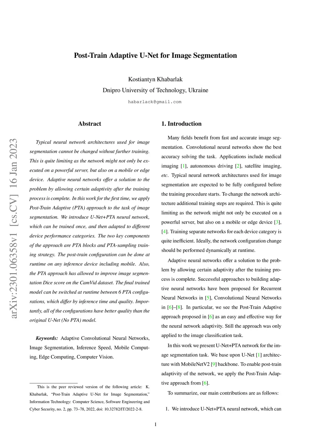 Typical neural network architectures used for image segmentation cannot be changed without further training. This is quite limiting as the network might not only be executed on a powerful server, but also on a mobile or edge device. Adaptive neural networks offer a solution to the problem by allowing certain adaptivity after the training process is complete. In this work for the first time, we apply Post-Train Adaptive (PTA) approach to the task of image segmentation. We introduce U-Net+PTA neural network, which can be trained once, and then adapted to different device performance categories. The two key components of the approach are PTA blocks and PTA-sampling training strategy. The post-train configuration can be done at runtime on any inference device including mobile. Also, the PTA approach has allowed to improve image segmentation Dice score on the CamVid dataset. The final trained model can be switched at runtime between 6 PTA configurations, which differ by inference time and quality. Importantly, all of the configurations have better quality than the original U-Net (No PTA) model.