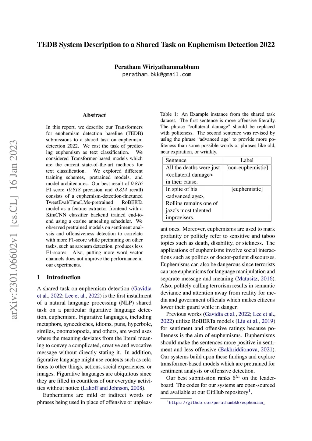 TEDB System Description to a Shared Task on Euphemism Detection 2022